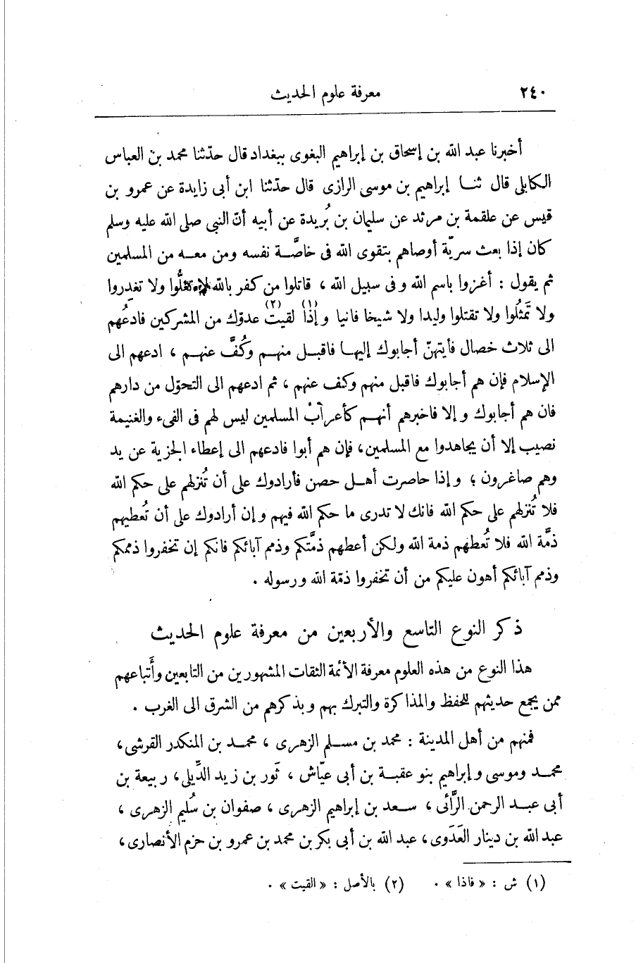 §ذِكْرُ النَّوْعِ التَّاسِعِ وَالْأَرْبَعِينَ مِنْ مَعْرِفَةِ عُلُومِ الْحَدِيثِ هَذَا النَّوْعُ مِنْ هَذِهِ الْعُلُومِ مَعْرِفَةُ الْأَئِمَّةِ الثِّقَاتِ الْمَشْهُورِينَ مِنَ التَّابِعِينَ وَأَتْبَاعِهِمْ مِمَّنْ يَجْمَعُ حَدِيثَهُمْ لِلْحِفْظِ، وَالْمُذَاكَرَةِ، وَالتَّبَرُّكِ بِهِمْ، وَبِذِكْرِهِمْ مِنَ الْمَشْرِقِ إِلَى الْغَرْبِ، فَمِنْهُمْ مِنْ أَهْلِ الْمَدِينَةِ: مُحَمَّدُ بْنُ مُسْلِمٍ الزُّهْرِيُّ، مُحَمَّدُ بْنُ الْمُنْكَدِرِ الْقُرَشِيُّ، مُحَمَّدٌ وَمُوسَى وَإِبْرَاهِيمُ بَنُو عُقْبَةَ بْنِ أَبِي عَيَّاشٍ، ثَوْرُ بْنُ زَيْدٍ الدِّيلِيُّ، رَبِيعَةُ بْنُ أَبِي عَبْدِ الرَّحْمَنِ الرَّائِيُّ، سَعْدُ بْنُ إِبْرَاهِيمَ الزُّهْرِيُّ، صَفْوَانُ بْنُ سُلَيْمٍ الزُّهْرِيُّ، عَبْدُ اللَّهِ بْنُ دِينَارٍ الْعَدَوِيُّ، عَبْدُ اللَّهِ بْنُ أَبِي بَكْرِ بْنِ مُحَمَّدِ بْنِ عَمْرِو بْنِ حَزْمٍ الْأَنْصَارِيُّ