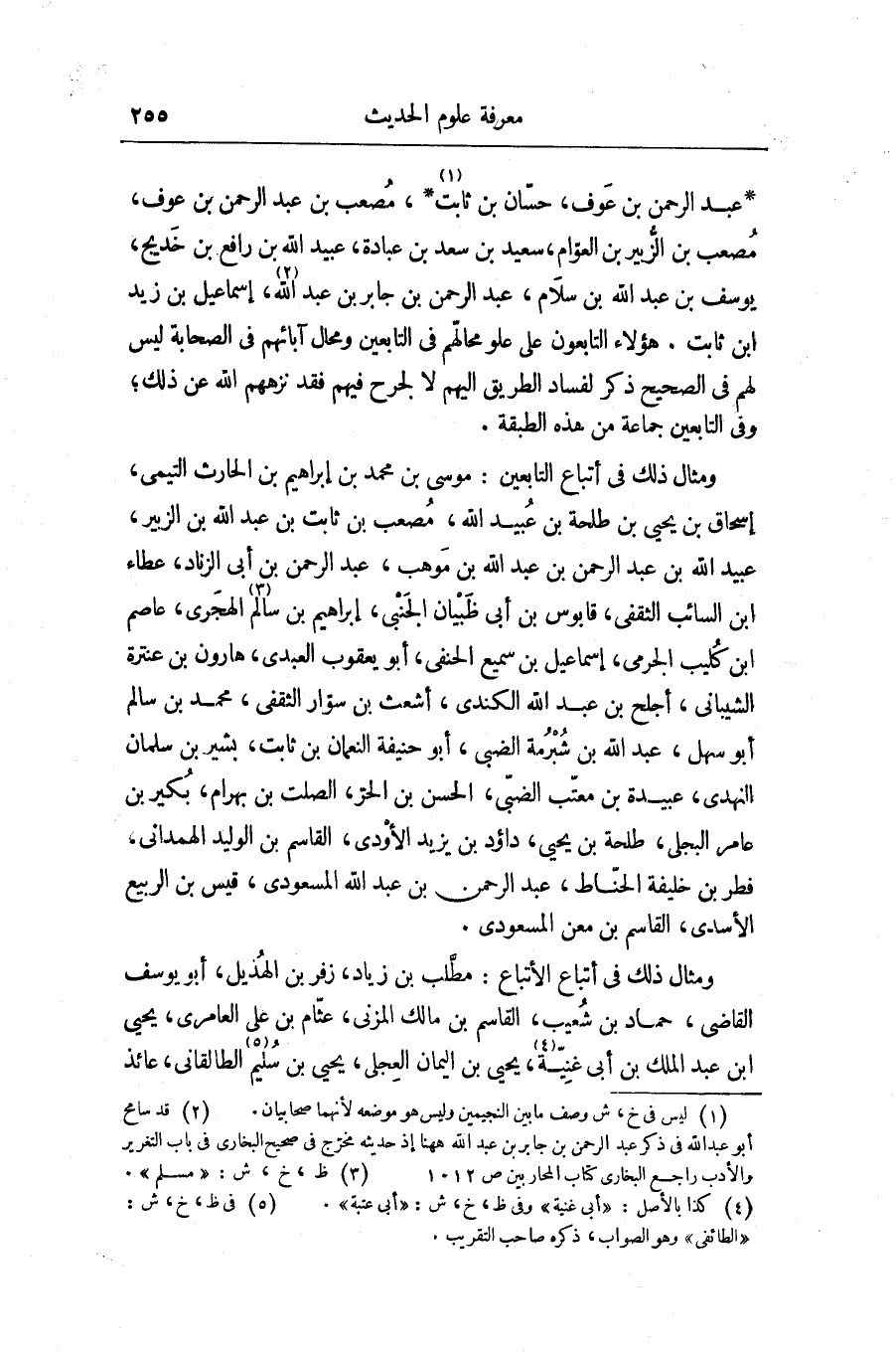 ، عَبْدُ الرَّحْمَنِ بْنُ عَوْفٍ، حَسَّانُ بْنُ ثَابِتٍ، مُصْعَبُ بْنُ عَبْدِ الرَّحْمَنِ بْنِ عَوْفٍ، مُصْعَبُ بْنُ الزُّبَيْرِ بْنِ الْعَوَّامِ، سَعِيدُ بْنُ سَعْدِ بْنِ عُبَادَةَ، عُبَيْدُ اللَّهِ بْنُ رَافِعِ بْنِ خَدِيجٍ، يُوسُفُ بْنُ عَبْدِ اللَّهِ بْنِ سَلَّامٍ، عَبْدُ الرَّحْمَنِ بْنُ جَابِرِ بْنِ عَبْدِ اللَّهِ، إِسْمَاعِيلُ بْنُ زَيْدِ بْنِ ثَابِتٍ، هَؤُلَاءِ التَّابِعُونَ عَلَى عُلُوِّ مَحَالِّهِمْ فِي التَّابِعِينَ، وَمَحَالِّ آبَائِهِمْ فِي الصَّحَابَةِ، لَيْسَ لَهُمْ فِي الصَّحِيحِ ذِكْرٌ لِفَسَادِ الطَّرِيقِ إِلَيْهِمْ، لَا لِجُرْحٍ فِيهِمْ فَقَدْ نَزَّهَهُمُ اللَّهُ عَنْ ذَلِكَ، وَفِي التَّابِعِينَ جَمَاعَةٌ مِنْ هَذِهِ الطَّبَقَةِ، وَمِثَالُ ذَلِكَ فِي أَتْبَاعِ التَّابِعِينَ مُوسَى بْنُ مُحَمَّدِ بْنِ إِبْرَاهِيمَ بْنِ الْحَارِثِ التَّيْمِيُّ، إِسْحَاقُ بْنُ يَحْيَى بْنِ طَلْحَةَ بْنِ عُبَيْدِ اللَّهِ، مُصْعَبُ بْنُ ثَابِتِ بْنِ عَبْدِ اللَّهِ بْنِ الزُّبَيْرِ، عُبَيْدُ اللَّهِ بْنُ عَبْدِ الرَّحْمَنِ بْنِ عَبْدِ اللَّهِ بْنِ مَوْهَبٍ، عَبْدُ الرَّحْمَنِ بْنُ أَبِي الزِّنَادٍ، عَطَاءُ بْنُ السَّائِبِ الثَّقَفِيُّ، قَابُوسُ بْنُ أَبِي ظَبْيَانَ الْجَنْبِيُّ، إِبْرَاهِيمُ بْنُ سَالِمٍ الْهَجَرِيُّ، عَاصِمُ بْنُ كُلَيْبٍ الْجَرْمِيُّ، إِسْمَاعِيلُ بْنُ سُمَيْعٍ الْحَنَفِيُّ، أَبُو يَعْقُوبَ الْعَبْدِيُّ، هَارُونُ بْنُ عَنْتَرَةَ الشَّيْبَانِيُّ، أَجْلَحُ بْنُ عَبْدِ اللَّهِ الْكِنْدِيُّ، أَشْعَثُ بْنُ سَوَّارٍ الثَّقَفِيُّ، مُحَمَّدُ بْنُ سَالِمٍ أَبُو سَهْلٍ، عَبْدُ اللَّهِ بْنُ شُبْرُمَةَ الضَّبِّيُّ، أَبُو حَنِيفَةَ النُّعْمَانُ بْنُ ثَابِتٍ، بَشِيرُ بْنُ سَلْمَانَ النَّهْدِيُّ، عُبَيْدَةُ بْنُ مُعَتِّبٍ الضَّبِّيُّ، الْحَسَنُ بْنُ الْحُرِّ، الصَّلْتُ بْنُ بَهْرَامَ، بُكَيْرُ بْنُ عَامِرٍ الْبَجَلِيُّ، طَلْحَةُ بْنُ يَحْيَى، دَاوُدُ بْنُ يَزِيدَ الْأَوْدِيُّ، الْقَاسِمُ بْنُ الْوَلِيدِ الْهَمْدَانِيُّ، فِطْرُ بْنُ خَلِيفَةَ الْحَنَّاطُ، عَبْدُ الرَّحْمَنِ بْنُ عَبْدِ اللَّهِ الْمَسْعُودِيُّ، قَيْسُ بْنُ الرَّبِيعِ الْأَسَدِيُّ، الْقَاسِمُ بْنُ مَعْنٍ الْمَسْعُودِيُّ وَمِثَالُ ذَلِكَ فِي أَتْبَاعِ الْأَتْبَاعِ: مُطَّلِبُ بْنُ زِيَادٍ، زُفَرُ بْنُ الْهُذَيْلِ، أَبُو يُوسُفَ الْقَاضِي، حَمَّادُ بْنُ شُعَيْبٍ، الْقَاسِمُ بْنُ مَالِكٍ الْمُزَنِيُّ، عَثَّامُ بْنُ عَلِيٍّ الْعَامِرِيُّ، يَحْيَى بْنُ عَبْدِ الْمَلِكِ بْنِ أَبِي غَنِيَّةَ، يَحْيَى بْنُ الْيَمَانِ الْعِجْلِيُّ، يَحْيَى بْنُ سُلَيْمٍ الطَّالْقَانِيُّ، عَائِذُ بْنُ حَبِيبٍ، مُحَمَّدُ بْنُ رَبِيعَةَ الْكِلَابِيُّ، عَبْدُ الْحَمِيدِ بْنُ عَبْدِ الرَّحْمَنِ الْحِمَّانِيُّ، عَلِيُّ بْنُ قَادِمٍ، عَمْرُو بْنُ مُحَمَّدٍ الْعَنْقَزِيُّ، سَعِيدُ بْنُ زَيْدٍ أَخُو حَمَّادٍ، الْحَكَمُ بْنُ سِنَانٍ الْفَرْبِيُّ، يُوسُفُ بْنُ خَالِدٍ السَّمْتِيُّ، صَفْوَانُ بْنُ عِيسَى الزُّهْرِيُّ، عَبْدُ اللَّهِ بْنُ دَاوُدَ الْخُرَيْبِيُّ، رَيْحَانُ بْنُ سَعِيدٍ الْقُرَشِيُّ، يَعْقُوبُ بْنُ إِسْحَاقَ الْحَضْرَمِيُّ، مَرْوَانُ بْنُ شُجَاعٍ الْجَزَرِيُّ، أَبُو قَتَادَةَ الْحَرَّانِيُّ، مُطَرِّفُ بْنُ مَازِنٍ، إِسْمَاعِيلُ بْنُ عَبْدِ الْكَرِيمِ الصَّنْعَانِيُّ، عَلِيُّ بْنُ عَاصِمٍ، مُحَمَّدُ بْنُ يَزِيدَ الْوَاسِطِيُّ وَمِثَالُ ذَلِكَ فِي الطَّبَقَةِ الْخَامِسَةِ مِنَ الْمُحَدِّثِينَ: عَوْنُ بْنُ عُمَارَةَ الْغُبَرِيُّ، وَالْقَاسِمُ بْنُ الْحَكَمِ الْعُرَنِيُّ وَمِثَالُ ذَلِكَ فِي الطَّبَقَةِ السَّادِسَةِ مِنَ الْمُحَدِّثِينَ: أَحْمَدُ بْنُ عَبْدِ الْجَبَّارِ الْعُطَارِدِيُّ، مُح
