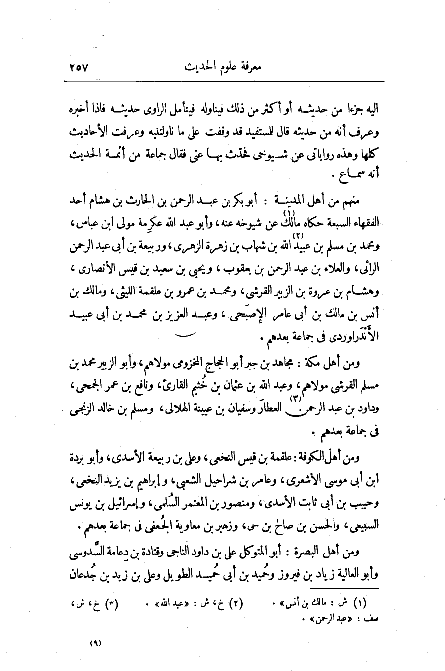 إِلَيْهِ جُزْءًا مِنْ حَدِيثِهِ أَوْ أَكْثَرَ مِنْ ذَلِكَ فَيُنَاوِلُهُ فَيَتَأَمَّلُ الرَّاوِي حَدِيثَهُ، فَإِذَا أَخْبَرَهُ وَعَرَفَ أَنَّهُ مِنْ حَدِيثِهِ، قَالَ لِلْمُسْتَفِيدِ: قَدْ وَقَفْتُ عَلَى مَا نَاوَلْتَنِيهِ، وَعَرَفْتَ الْأَحَادِيثَ كُلَّهَا، وَهَذِهِ رِوَايَاتِي عَنْ شُيُوخِي، فَحَدِّثْ بِهَا عَنِّي، فَقَالَ جَمَاعَةٌ مِنْ أَئِمَّةِ الْحَدِيثِ: إِنَّهُ سَمَاعٌ مِنْهُمْ مِنْ أَهْلِ الْمَدِينَةِ: أَبُو بَكْرِ بْنُ عَبْدِ الرَّحْمَنِ بْنِ الْحَارِثِ بْنِ هِشَامٍ أَحَدُ الْفُقَهَاءِ السَّبْعَةِ، حَكَاهُ مَالِكٌ عَنْ شُيُوخِهِ عَنْهُ، وَأَبُو عَبْدِ اللَّهِ عِكْرِمَةُ مَوْلَى ابْنُ عَبَّاسٍ، وَمُحَمَّدُ بْنُ مُسْلِمِ بْنِ عُبَيْدِ اللَّهِ بْنِ شِهَابِ بْنِ زُهْرَةَ الزُّهْرِيُّ، وَرَبِيعَةُ بْنُ أَبِي عَبْدِ الرَّحْمَنِ الرَّائِيُّ، وَالْعَلَاءُ بْنُ عَبْدِ الرَّحْمَنِ بْنِ يَعْقُوبَ، وَيَحْيَى بْنُ سَعِيدِ بْنِ قَيْسٍ الْأَنْصَارِيُّ، وَهِشَامُ بْنُ عُرْوَةَ بْنِ الزُّبَيْرِ الْقُرَشِيُّ، وَمُحَمَّدُ بْنُ عَمْرِو بْنِ عَلْقَمَةَ اللَّيْثِيُّ، وَمَالِكُ بْنُ أَنَسِ بْنِ مَالِكِ بْنِ أَبِي عَامِرٍ الْأَصْبَحِيُّ، وَعَبْدُ الْعَزِيزِ بْنُ مُحَمَّدِ بْنِ أَبِي عُبَيْدٍ الْأَنْدَرَاوَرْدِيُّ فِي جَمَاعَةٍ بَعْدَهُمْ وَمِنْ أَهْلِ مَكَّةَ: مُجَاهِدُ بْنُ جَبْرٍ، أَبُو الْحَجَّاجِ الْمَخْزُومِيُّ مَوْلَاهُمْ، وَأَبُو الزُّبَيْرِ مُحَمَّدُ بْنُ مُسْلِمٍ الْقُرَشِيُّ مَوْلَاهُمْ، وَعَبْدُ اللَّهِ بْنُ عُثْمَانَ بْنِ خُثَيْمٍ الْقَارِئُ، وَنَافِعُ بْنُ عُمَرَ الْجُمَحِيُّ، وَدَاوُدُ بْنُ عَبْدِ الرَّحْمَنِ الْعَطَّارُ، وَسُفْيَانُ بْنُ عُيَيْنَةَ الْهِلَالِيُّ، وَمُسْلِمُ بْنُ خَالِدٍ الزَّنْجِيُّ فِي جَمَاعَةٍ بَعْدَهُمْ وَمِنْ أَهْلِ الْكُوفَةِ: عَلْقَمَةُ بْنُ قَيْسٍ النَّخَعِيُّ، وَعَلِيُّ بْنُ رَبِيعَةَ الْأَسَدِيُّ، وَأَبُو بُرْدَةَ بْنُ أَبِي مُوسَى الْأَشْعَرِيُّ، وَعَامِرُ بْنُ شَرَاحِيلَ الشَّعْبِيُّ، وَإِبْرَاهِيمُ بْنُ يَزِيدَ النَّخَعِيُّ، وَحَبِيبُ بْنُ أَبِي ثَابِتٍ الْأَسَدِيُّ، وَمَنْصُورُ بْنُ الْمُعْتَمِرِ السُّلَمِيُّ، وَإِسْرَائِيلُ بْنُ يُونُسَ السَّبِيعِيُّ، وَالْحَسَنُ بْنُ صَالِحِ بْنِ حَيٍّ، وَزُهَيْرُ بْنُ مُعَاوِيَةَ الْجُعْفِيُّ فِي جَمَاعَةٍ بَعْدَهُمْ وَمِنْ أَهْلِ الْبَصْرَةِ: أَبُو الْمُتَوَكِّلِ عَلِيُّ بْنُ دَاوُدَ النَّاجِيُّ، وَقَتَادَةُ بْنُ دِعَامَةَ السَّدُوسِيُّ، وَأَبُو الْعَالِيَةِ زِيَادُ بْنُ فَيْرُوزَ، وَحُمَيْدُ بْنُ أَبِي حُمَيْدٍ الطَّوِيلُ، وَعَلِيُّ بْنُ زَيْدِ بْنِ جُدْعَانَ
