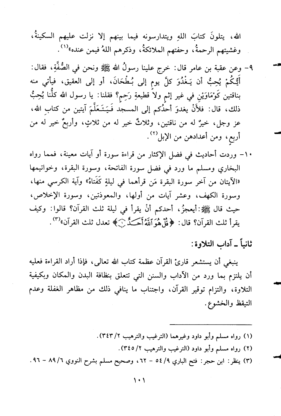 10 - وردت أحاديث في فضل الإكثار من قراءة سورة أو آيات معينة، فمما رواه البخاري ومسلم ما ورد في فضل سورة الفاتحة، وسورة البقرة، وخواتيمها «الآيتان من آخر سورة البقرة من قرأهما في ليلة كفتاه» وآية الكرسي منها، وسورة الكهف، وعشر آيات من أولها، والمعوذتين، وسورة الإخلاص، حيث قال صلى الله عليه وسلم: أيعجز، أحدكم أن يقرأ في ليلة ثلث القرآن؟ قالوا: وكيف يقرأ ثلث القرآن؟ قال: قُلْ هُوَ اللَّهُ أَحَدٌ (1) تعدل ثلث القرآن» (¬3).
