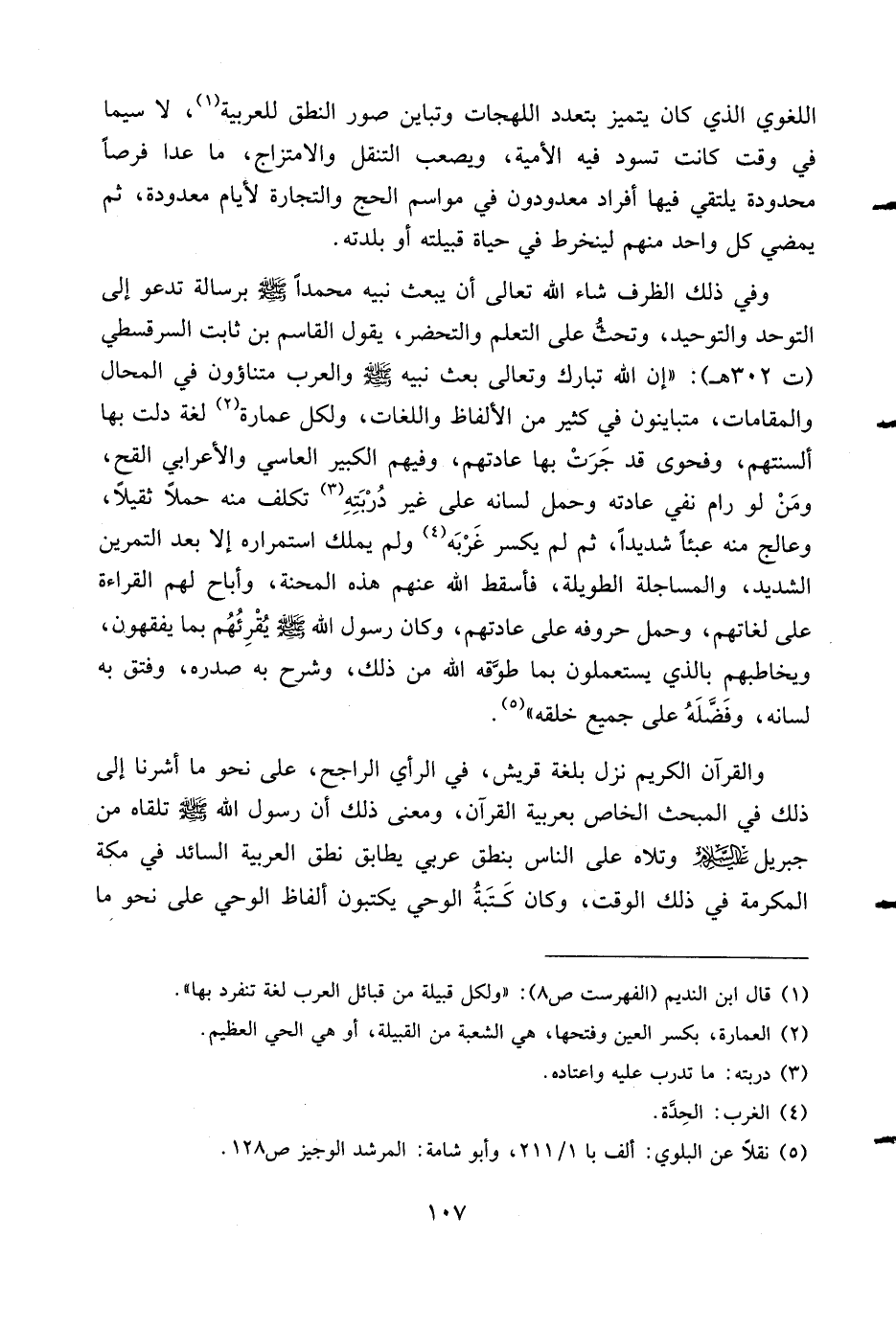 وفي ذلك الظرف شاء الله تعالى أن يبعث نبيه محمدا صلى الله عليه وسلم برسالة تدعو إلى التوحيد والتوحيد، وتحثّ على التعلم والتحضر، يقول القاسم بن ثابت السرقسطي (ت 302 هـ): «إن الله تبارك وتعالى بعث نبيه صلى الله عليه وسلم والعرب متناءون في المحال والمقامات، متباينون في كثير من الألفاظ واللغات، ولكل عمارة (¬2) لغة دلت بها ألسنتهم، وفحوى قد جرت بها عادتهم، وفيهم الكبير العاسي والأعرابي القح، ومن لو رام نفي عادته وحمل لسانه على غير دربته (¬3) تكلف منه حملا ثقيلا، وعالج منه عبئا شديدا، ثم لم يكسر غربه (¬4) ولم يملك استمراره إلا بعد التمرين الشديد، والمساجلة الطويلة، فأسقط الله عنهم هذه المحنة، وأباح لهم القراءة على لغاتهم، وحمل حروفه على عادتهم، وكان رسول الله صلى الله عليه وسلم يقرئهم بما يفقهون، ويخاطبهم بالذي يستعملون بما طوّقه الله من ذلك، وشرح به صدره، وفتق به لسانه، وفضّله على جميع خلقه» (¬5).