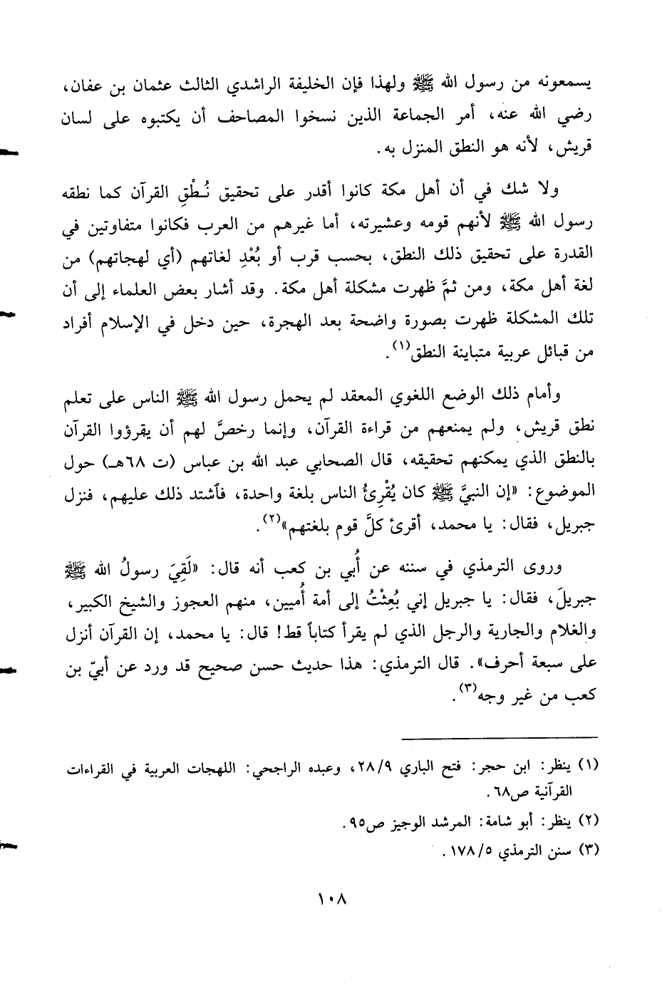 يسمعونه من رسول الله صلى الله عليه وسلم ولهذا فإن الخليفة الراشدي الثالث عثمان بن عفان، رضي الله عنه، أمر الجماعة الذين نسخوا المصاحف أن يكتبوه على لسان قريش، لأنه هو النطق المنزل به.