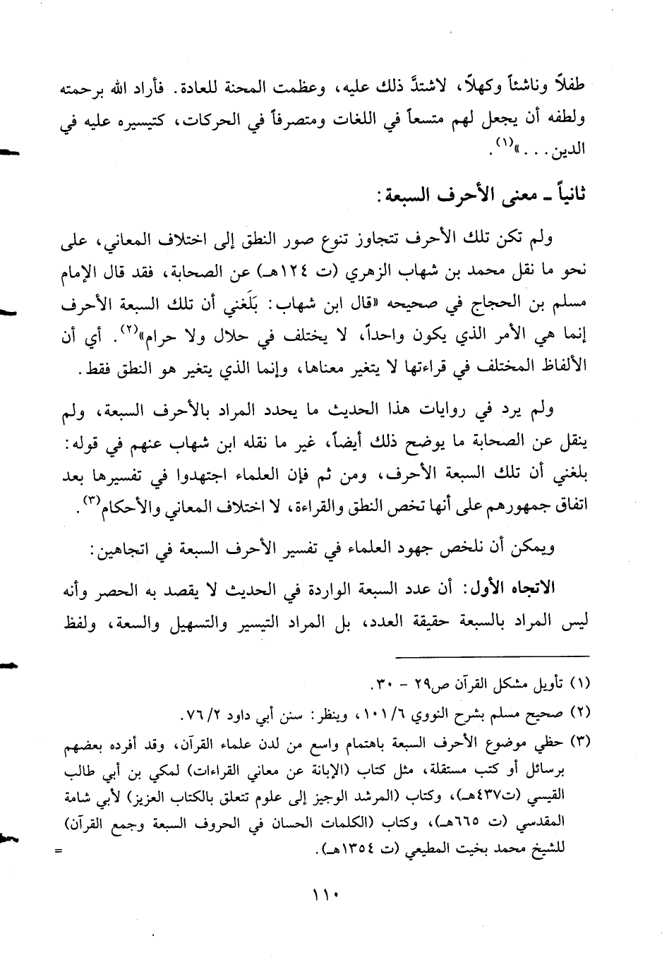 (¬3) حظي موضوع الأحرف السبعة باهتمام واسع من لدن علماء القرآن، وقد أفرده بعضهم برسائل أو كتب مستقلة، مثل كتاب (الإبانة عن معاني القراءات) لمكي بن أبي طالب القيسي (ت 437 هـ)، وكتاب (المرشد الوجيز إلى علوم تتعلق بالكتاب العزيز) لأبي شامة المقدسي (ت 665 هـ)، وكتاب (الكلمات الحسان في الحروف السبعة وجمع القرآن) للشيخ محمد بخيت المطيعي (ت 1354 هـ).