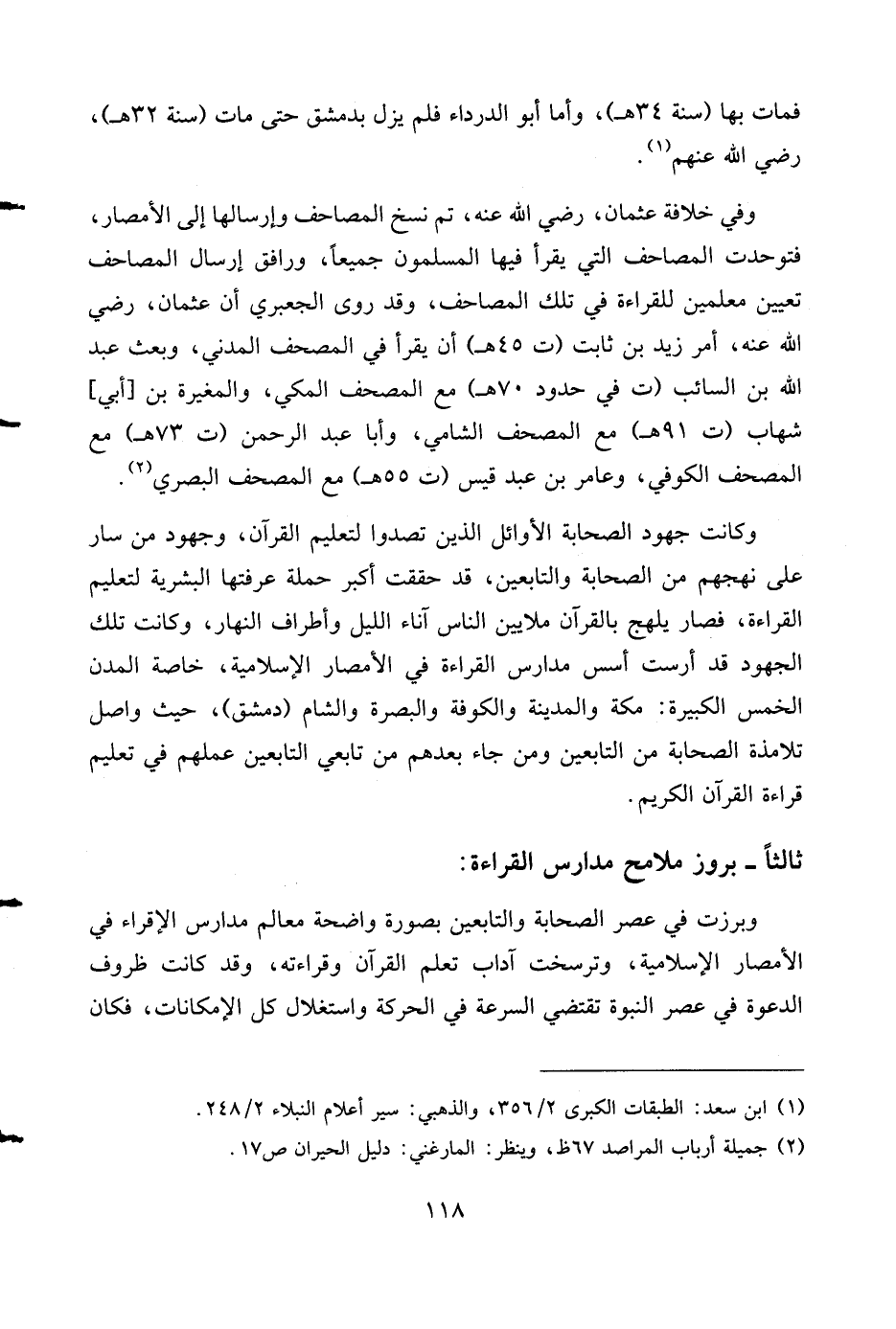وفي خلافة عثمان، رضي الله عنه، تم نسخ المصاحف وإرسالها إلى الأمصار، فتوحدت المصاحف التي يقرأ فيها المسلمون جميعا، ورافق إرسال المصاحف تعيين معلمين للقراءة في تلك المصاحف، وقد روى الجعبري أن عثمان، رضي الله عنه، أمر زيد بن ثابت (ت 45 هـ) أن يقرأ في المصحف المدني، وبعث عبد الله بن السائب (ت في حدود 70 هـ) مع المصحف المكي، والمغيرة بن [أبي] شهاب (ت 91 هـ) مع المصحف الشامي، وأبا عبد الرحمن (ت 73 هـ) مع المصحف الكوفي، وعامر بن عبد قيس (ت 55 هـ) مع المصحف البصري (¬2).