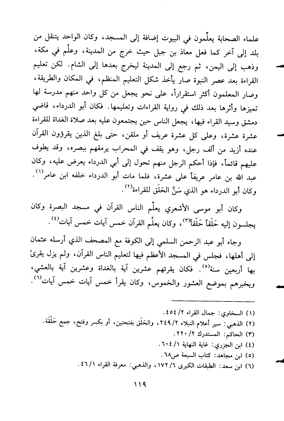 وكان أبو موسى الأشعري يعلّم الناس القرآن في مسجد البصرة وكان يجلسون إليه حلقا حلقا (¬3)، وكان يعلّم القرآن خمس آيات خمس آيات (¬4).
