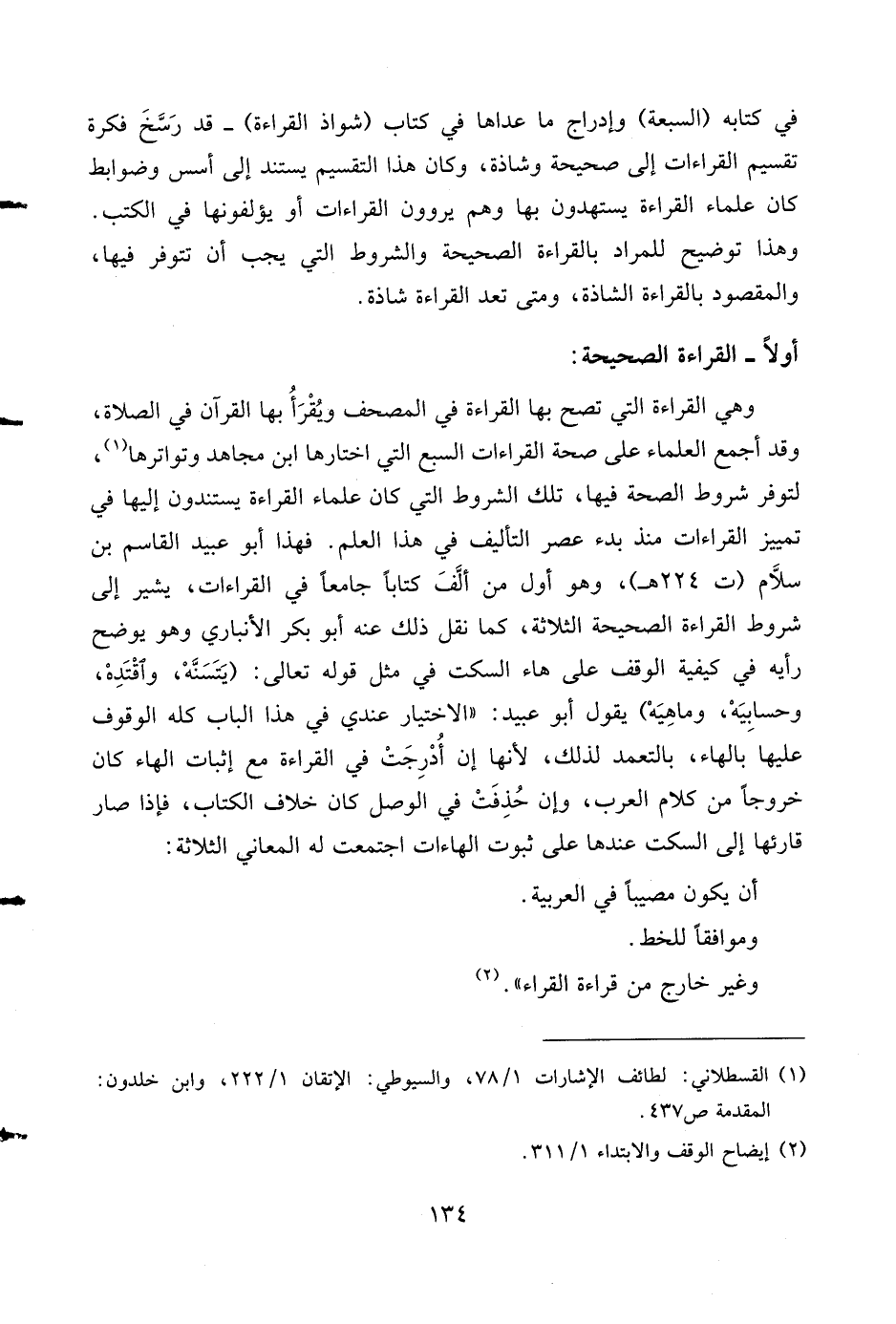 وهي القراءة التي تصح بها القراءة في المصحف ويقرأ بها القرآن في الصلاة، وقد أجمع العلماء على صحة القراءات السبع التي اختارها ابن مجاهد وتواترها (¬1)، لتوفر شروط الصحة فيها، تلك الشروط التي كان علماء القراءة يستندون إليها في تمييز القراءات منذ بدء عصر التأليف في هذا العلم. فهذا أبو عبيد القاسم بن سلّام (ت 224 هـ)، وهو أول من ألّف كتابا جامعا في القراءات، يشير إلى شروط القراءة الصحيحة الثلاثة، كما نقل ذلك عنه أبو بكر الأنباري وهو يوضح رأيه في كيفية الوقف على هاء السكت في مثل قوله تعالى: (يتسنّه، واقتده، وحسابيه، وماهيه) يقول أبو عبيد: «الاختيار عندي في هذا الباب كله الوقوف عليها بالهاء، بالتعمد لذلك، لأنها إن أدرجت في القراءة مع إثبات الهاء كان خروجا من كلام العرب، وإن حذفت في الوصل كان خلاف الكتاب، فإذا صار قارئها إلى السكت عندها على ثبوت الهاءات اجتمعت له المعاني الثلاثة: