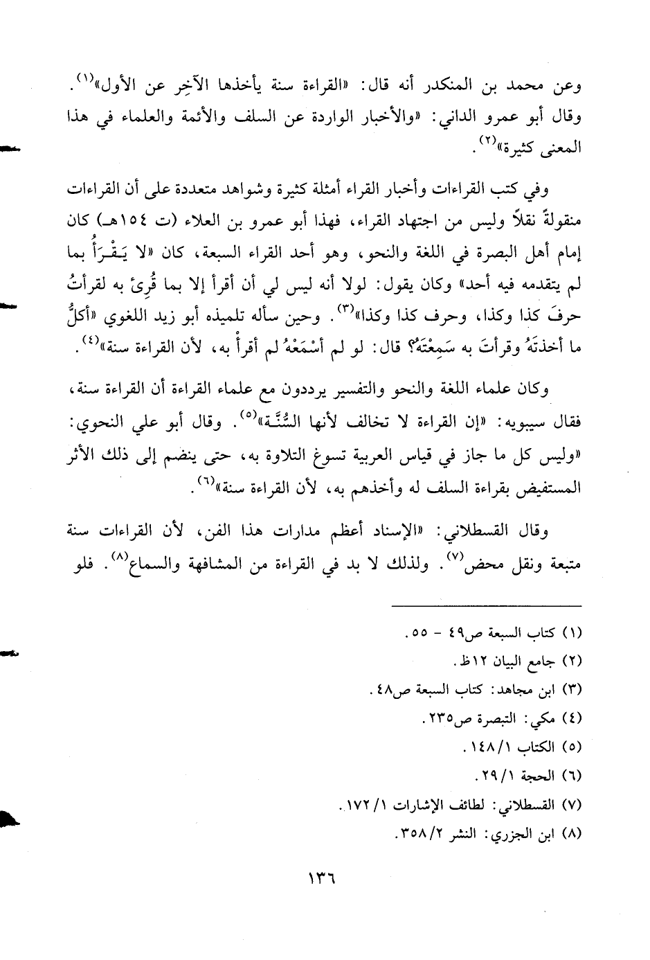 وقال القسطلاني: «الإسناد أعظم مدارات هذا الفن، لأن القراءات سنة متبعة ونقل محض (¬7). ولذلك لا بد في القراءة من المشافهة والسماع (¬8). فلو