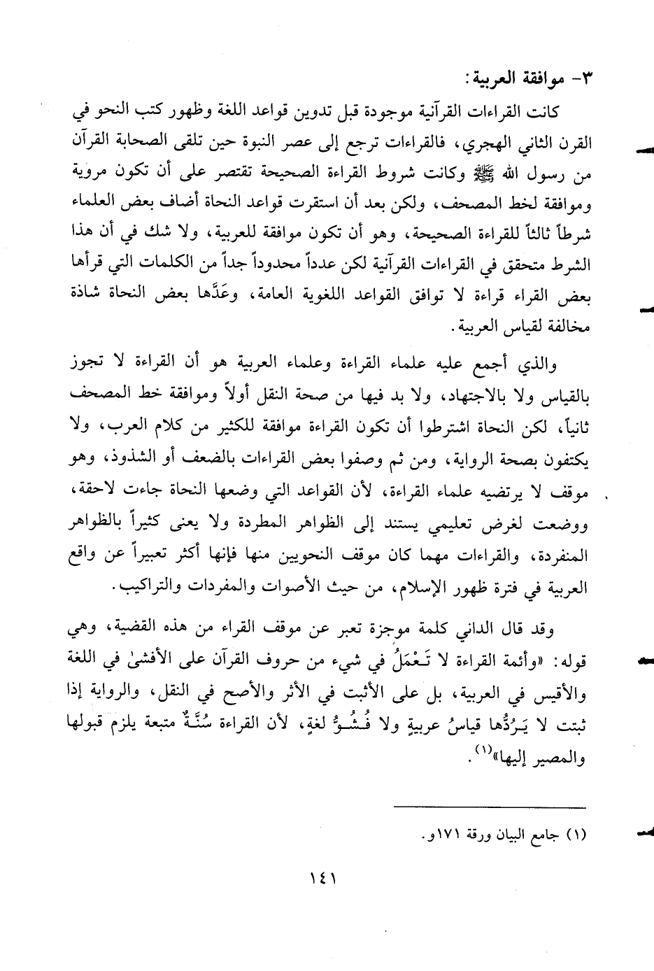 والذي أجمع عليه علماء القراءة وعلماء العربية هو أن القراءة لا تجوز بالقياس ولا بالاجتهاد، ولا بد فيها من صحة النقل أولا وموافقة خط المصحف ثانيا، لكن النحاة اشترطوا أن تكون القراءة موافقة للكثير من كلام العرب، ولا يكتفون بصحة الرواية، ومن ثم وصفوا بعض القراءات بالضعف أو الشذوذ، وهو موقف لا يرتضيه علماء القراءة، لأن القواعد التي وضعها النحاة جاءت لاحقة، ووضعت لغرض تعليمي يستند إلى الظواهر المطردة ولا يعنى كثيرا بالظواهر المنفردة، والقراءات مهما كان موقف النحويين منها فإنها أكثر تعبيرا عن واقع العربية في فترة ظهور الإسلام، من حيث الأصوات والمفردات والتراكيب.