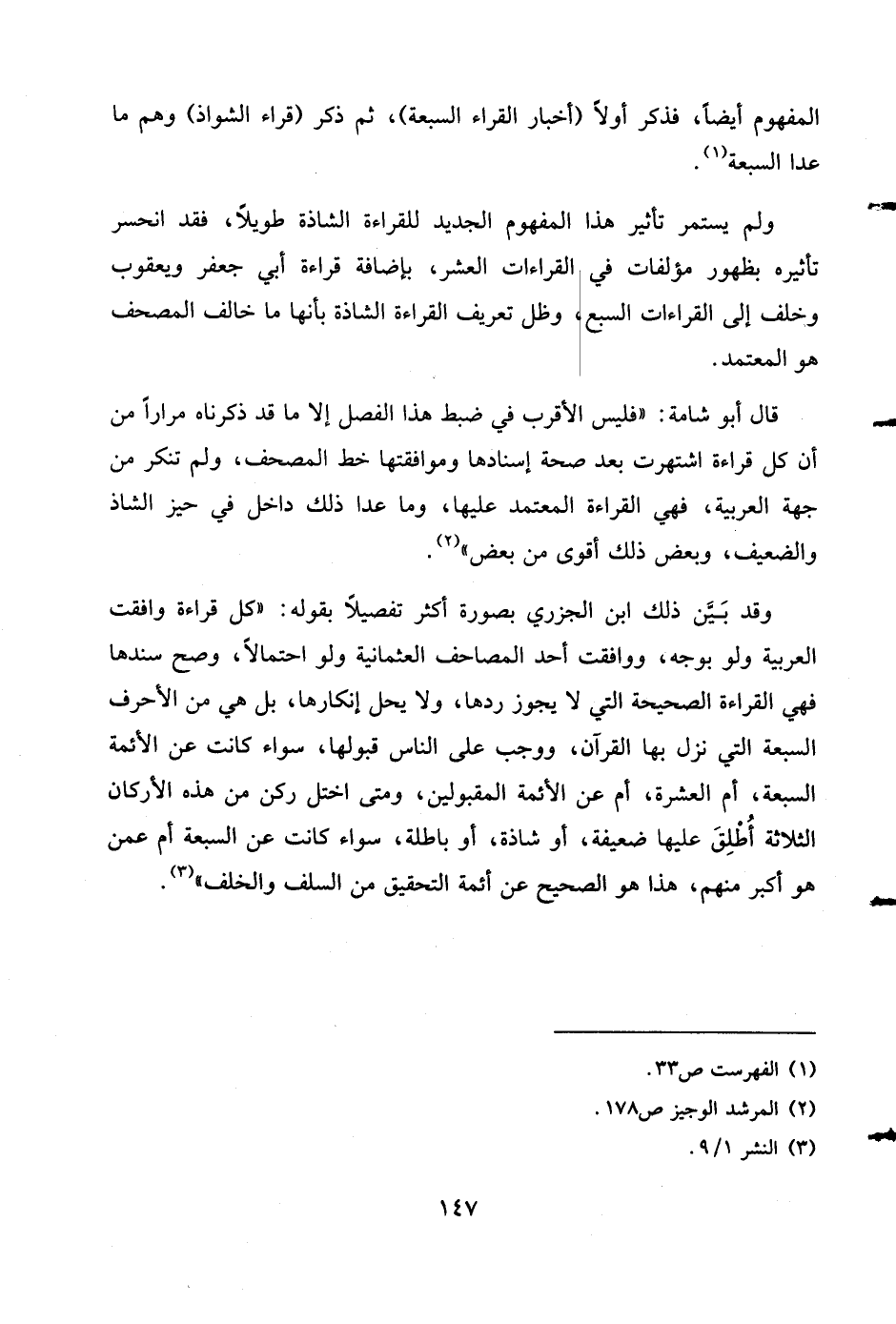 قال أبو شامة: «فليس الأقرب في ضبط هذا الفصل إلا ما قد ذكرناه مرارا من أن كل قراءة اشتهرت بعد صحة إسنادها وموافقتها خط المصحف، ولم تنكر من جهة العربية، فهي القراءة المعتمد عليها، وما عدا ذلك داخل في حيز الشاذ والضعيف، وبعض ذلك أقوى من بعض» (¬2).