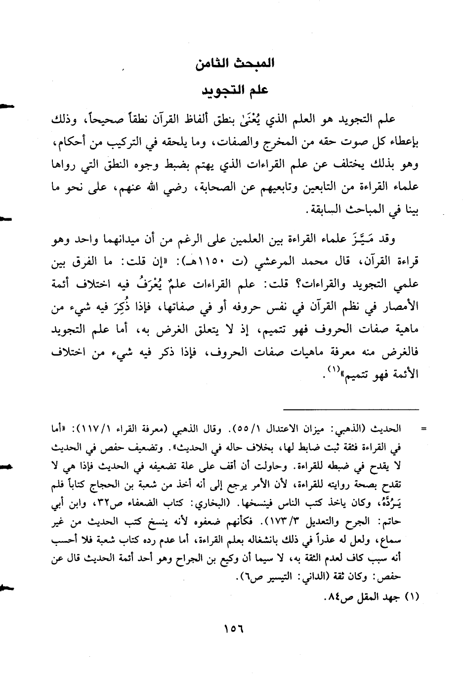 الحديث (الذهبي: ميزان الاعتدال 1/ 55). وقال الذهبي (معرفة القراء 1/ 117): «أما في القراءة فثقة ثبت ضابط لها، بخلاف حاله في الحديث». وتضعيف حفص في الحديث لا يقدح في ضبطه للقراءة. وحاولت أن أقف على علة تضعيفه في الحديث فإذا هي لا تقدح بصحة روايته للقراءة، لأن الأمر يرجع إلى أنه أخذ من شعبة بن الحجاج كتابا فلم يردّه، وكان ياخذ كتب الناس فينسخها. (البخاري: كتاب الضعفاء ص 32، وابن أبي حاتم: الجرح والتعديل 3/ 173). فكأنهم ضعفوه لأنه ينسخ كتب الحديث من غير سماع، ولعل له عذرا في ذلك بانشغاله بعلم القراءة، أما عدم رده كتاب شعبة فلا أحسب أنه سبب كاف لعدم الثقة به، لا سيما أن وكيع بن الجراح وهو أحد أئمة الحديث قال عن حفص: وكان ثقة (الداني: التيسير ص 6).