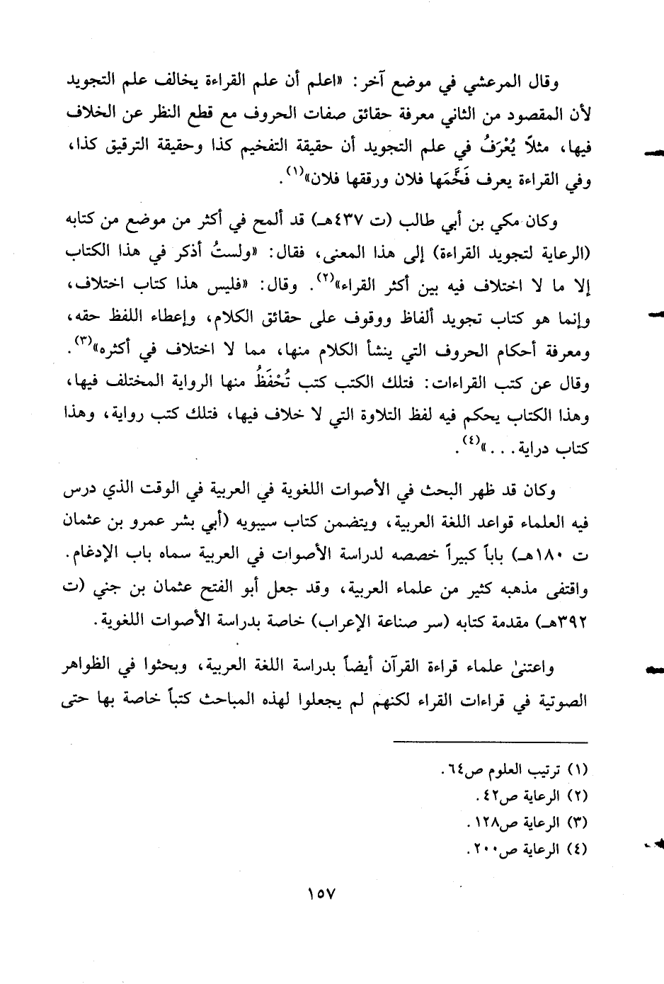وكان مكي بن أبي طالب (ت 437 هـ) قد ألمح في أكثر من موضع من كتابه (الرعاية لتجويد القراءة) إلى هذا المعنى، فقال: «ولست أذكر في هذا الكتاب إلا ما لا اختلاف فيه بين أكثر القراء» (¬2). وقال: «فليس هذا كتاب اختلاف، وإنما هو كتاب تجويد ألفاظ ووقوف على حقائق الكلام، وإعطاء اللفظ حقه، ومعرفة أحكام الحروف التي ينشأ الكلام منها، مما لا اختلاف في أكثره» (¬3).