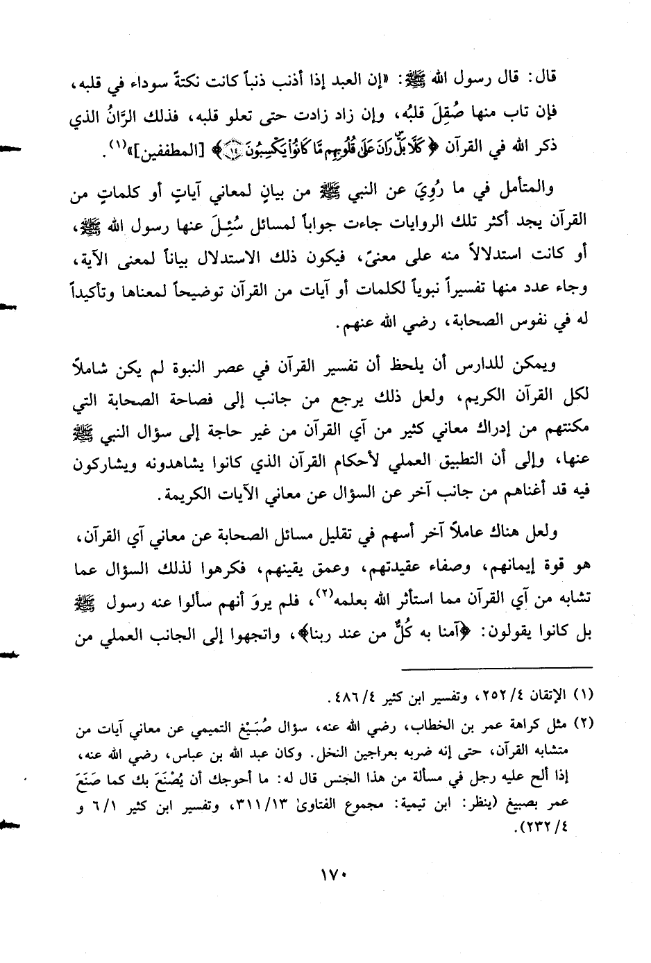 ولعل هناك عاملا آخر أسهم في تقليل مسائل الصحابة عن معاني آي القرآن، هو قوة إيمانهم، وصفاء عقيدتهم، وعمق يقينهم، فكرهوا لذلك السؤال عما تشابه من آي القرآن مما استأثر الله بعلمه (¬2)، فلم يرو أنهم سألوا عنه رسول صلى الله عليه وسلم بل كانوا يقولون: آمَنَّا بِهِ كُلٌّ مِنْ عِنْدِ رَبِّنا، واتجهوا إلى الجانب العملي من