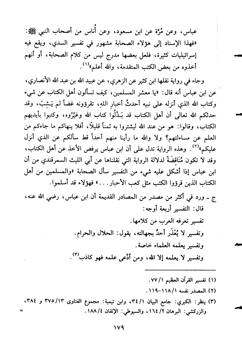 ج- ورد في أكثر من مصدر من المصادر القديمة أن ابن عباس، رضي الله عنه، قال: التفسير أربعة أوجه:
