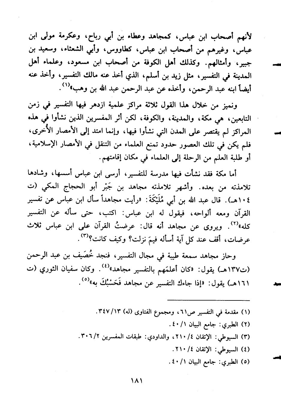 ونميز من خلال هذا القول ثلاثة مراكز علمية ازدهر فيها التفسير في زمن التابعين، هي مكة، والمدينة، والكوفة، لكن أثر المفسرين الذين نشئوا في هذه المراكز لم يقتصر على المدن التي نشئوا فيها، وإنما امتد إلى الأمصار الأخرى، فلم يكن في تلك العصور حدود تمنع العلماء من التنقل في الأمصار الإسلامية، أو طلبة العلم من الرحلة