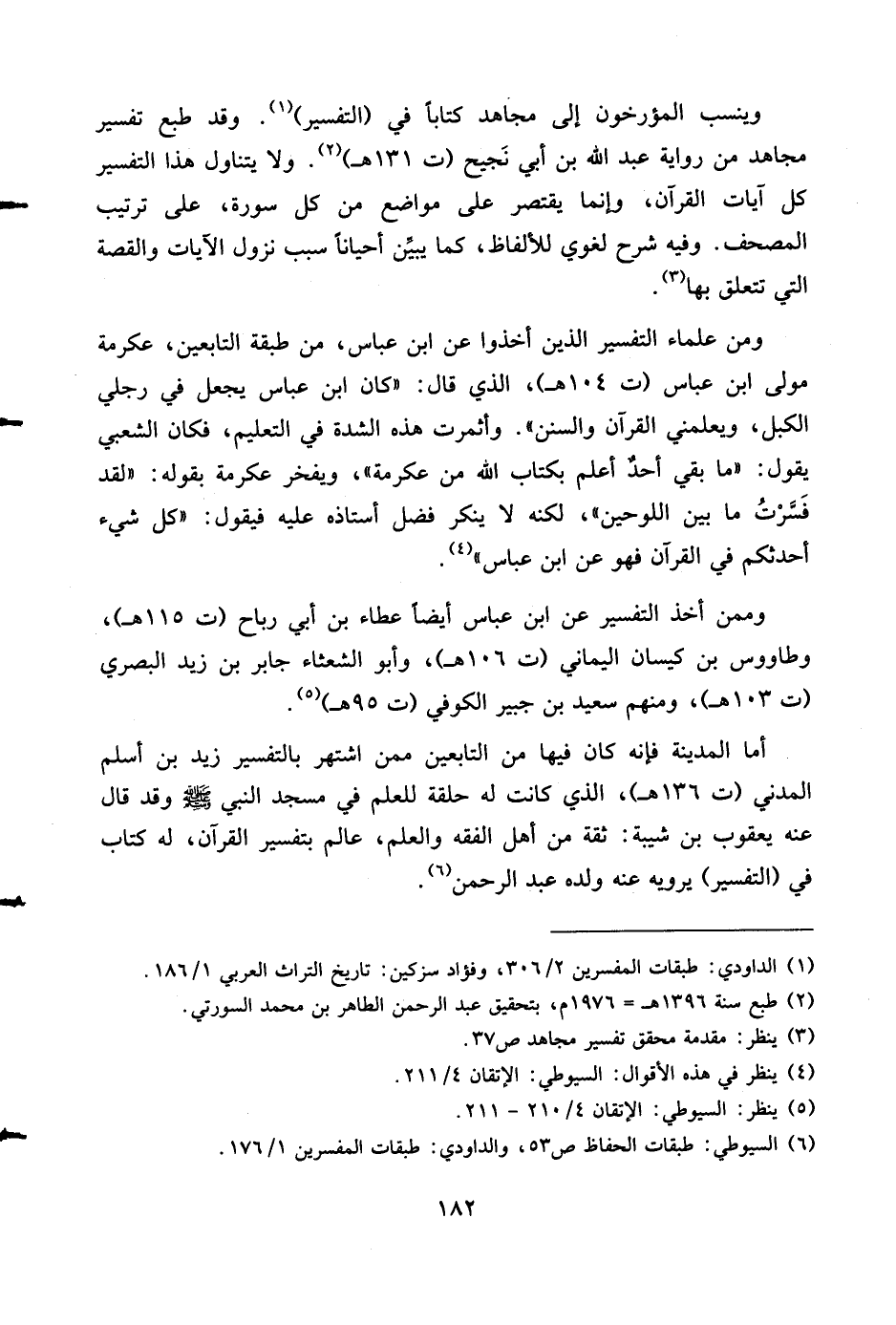 وينسب المؤرخون إلى مجاهد كتابا في (التفسير) (¬1). وقد طبع تفسير مجاهد من رواية عبد الله بن أبي نجيح (ت 131 هـ) (¬2). ولا يتناول هذا التفسير كل آيات القرآن، وإنما يقتصر على مواضع من كل سورة، على ترتيب المصحف. وفيه شرح لغوي للألفاظ، كما يبيّن أحيانا سبب نزول الآيات والقصة التي تتعلق بها (¬3).