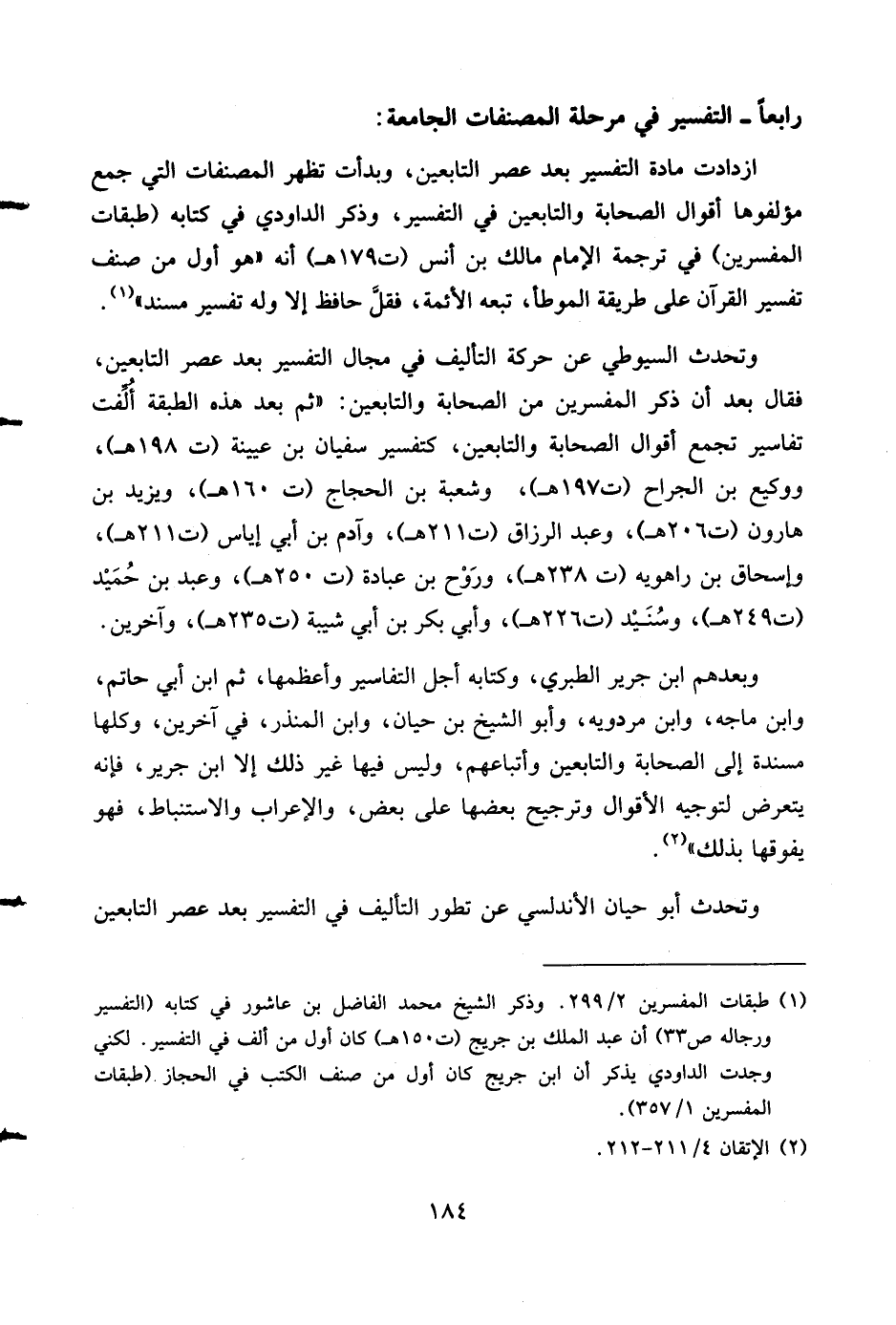(¬1) طبقات المفسرين 2/ 299. وذكر الشيخ محمد الفاضل بن عاشور في كتابه (التفسير ورجاله ص 33) أن عبد الملك بن جريج (ت 150 هـ) كان أول من ألف في التفسير. لكني وجدت الداودي يذكر أن ابن جريج كان أول من صنف الكتب في الحجاز (طبقات المفسرين 1/ 357).