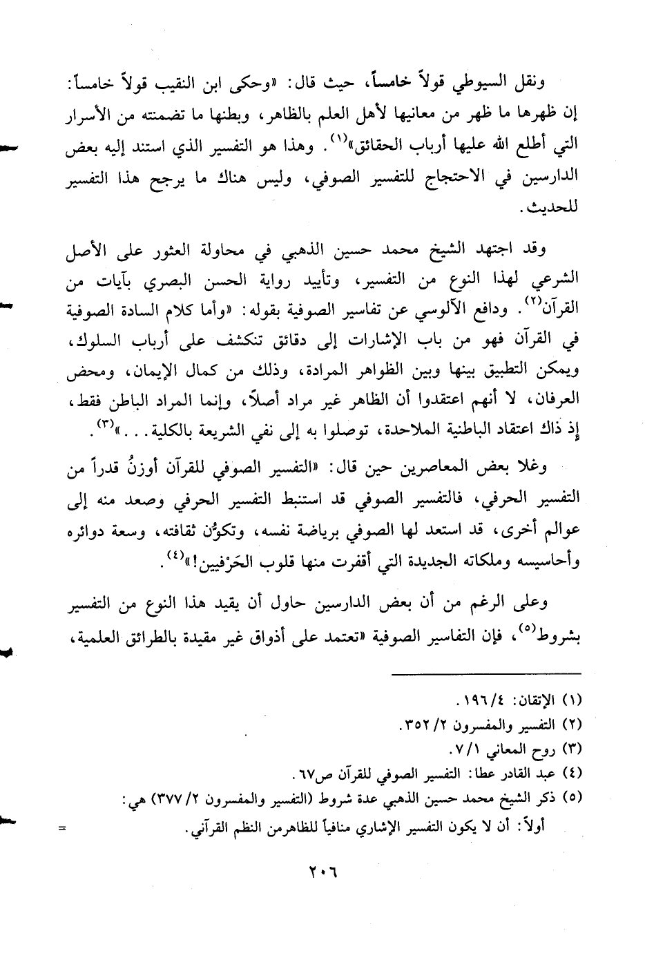 وغلا بعض المعاصرين حين قال: «التفسير الصوفي للقرآن أوزن قدرا من التفسير الحرفي، فالتفسير الصوفي قد استنبط التفسير الحرفي وصعد منه إلى عوالم أخرى، قد استعد لها الصوفي برياضة نفسه، وتكوّن ثقافته، وسعة دوائره وأحاسيسه وملكاته الجديدة التي أقفرت منها قلوب الحرفيين!» (¬4).