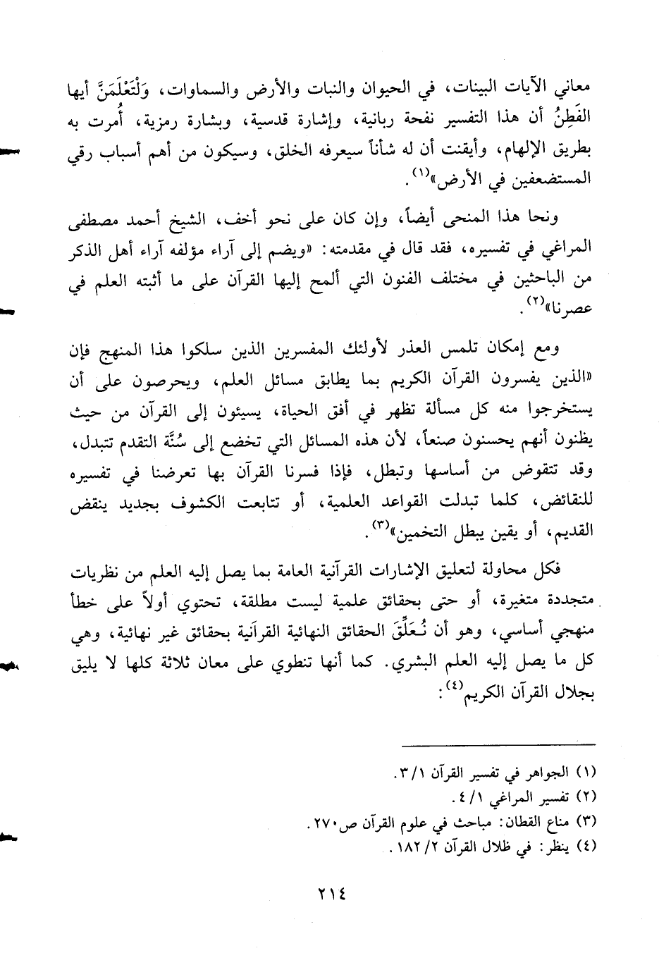 ونحا هذا المنحى أيضا، وإن كان على نحو أخف، الشيخ أحمد مصطفى المراغي في تفسيره، فقد قال في مقدمته: «ويضم إلى آراء مؤلفه آراء أهل الذكر من الباحثين في مختلف الفنون التي ألمح إليها القرآن على ما أثبته العلم في عصرنا» (¬2).