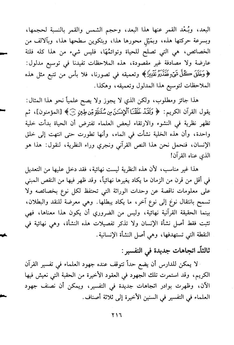 يقول القرآن الكريم: وَلَقَدْ خَلَقْنَا الْإِنْسانَ مِنْ سُلالَةٍ مِنْ طِينٍ (12) [المؤمنون]، ثم تظهر نظرية في النشوء والارتقاء لبعض العلماء تفترض أن الحياة بدأت خلية واحدة، وأن هذه الخلية نشأت في الماء، وأنها تطورت حتى انتهت إلى خلق الإنسان، فنحمل نحن هذا النص القرآني ونجري وراء النظرية، لنقول: هذا هو الذي عناه القرآن! هذا غير مناسب، لأن هذه النظرية ليست نهائية، فقد دخل عليها من التعديل في أقل من قرن من الزمان ما يكاد يغيرها نهائيا، وقد ظهر فيها من النقص المبني على معلومات ناقصة عن وحدات الوراثة التي تحتفظ لكل نوع بخصائصه ولا تسمح بانتقال نوع إلى نوع آخر، ما يكاد يبطلها. وهي معرضة للنقد والبطلان، بينما الحقيقة القرآنية نهائية، وليس من الضروري أن يكون هذا معناها، فهي تثبت فقط أصل نشأة الإنسان ولا تذكر تفصيلات هذه النشأة، وهي نهائية في النقطة التي تستهدفها، وهي أصل النشأة الإنسانية.