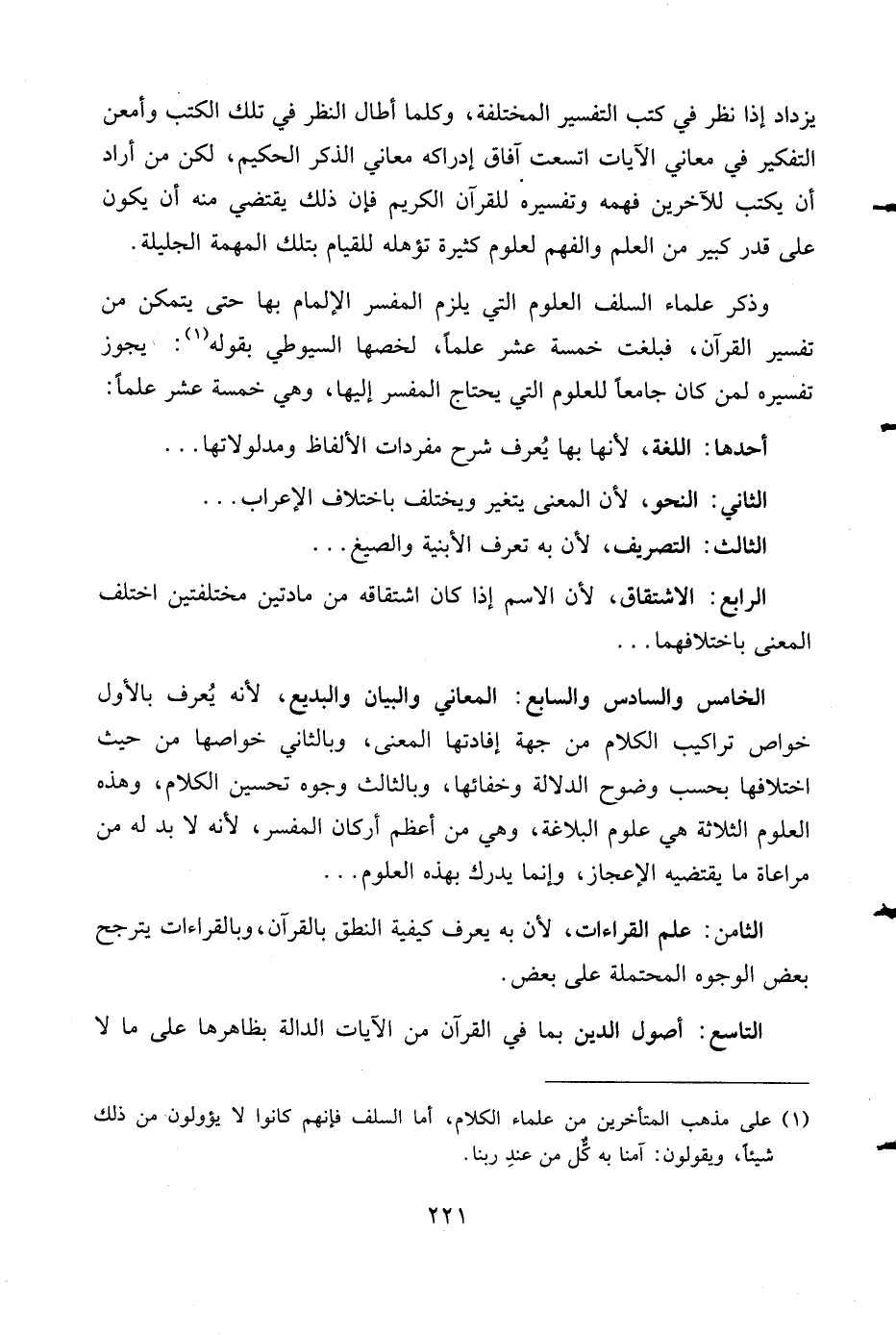 وذكر علماء السلف العلوم التي يلزم المفسر الإلمام بها حتى يتمكن من تفسير القرآن، فبلغت خمسة عشر علما، لخصها السيوطي بقوله (¬1): يجوز تفسيره لمن كان جامعا للعلوم التي يحتاج المفسر إليها، وهي خمسة عشر علما: