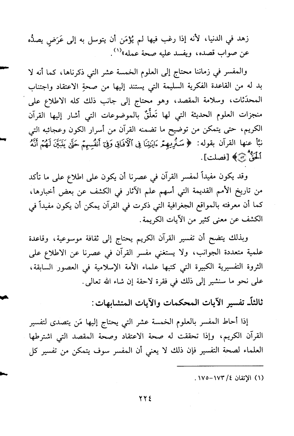 والمفسر في زماننا محتاج إلى العلوم الخمسة عشر التي ذكرناها، كما أنه لا بد له من القاعدة الفكرية السلمية التي يستند إليها من صحة الاعتقاد واجتناب المحدثات، وسلامة المقصد، وهو محتاج إلى جانب ذلك كله الاطلاع على منجزات العلوم الحديثة التي لها تعلّق بالموضوعات التي أشار إليها القرآن الكريم، حتى يتمكن من توضيح ما تضمنه القرآن من أسرار الكون وعجائبه التي نبّأ عنها القرآن بقوله: سَنُرِيهِمْ آياتِنا فِي الْآفاقِ وَفِي أَنْفُسِهِمْ حَتَّى يَتَبَيَّنَ لَهُمْ أَنَّهُ الْحَقُّ (53) [فصلت].