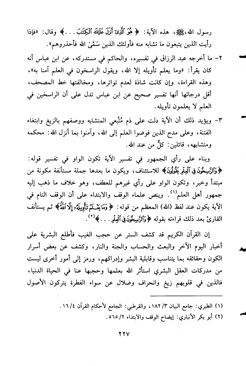 وَالرَّاسِخُونَ فِي الْعِلْمِ يَقُولُونَ للاستئناف، ويكون ما بعدها جملة مستأنفة مكونة من مبتدأ وخبر، وتكون الواو على رأي غيرهم للعطف، وهو خلاف ما ذهب إليه جمهور أهل العلم (¬1). وينص علماء الوقف والابتداء على أن الوقف التام في الآية يكون عند لفظ (الله) المعظم من قوله: وَما يَعْلَمُ تَأْوِيلَهُ إِلَّا اللَّهُ ثم يستأنف القارئ بعد ذلك قراءته بقوله وَالرَّاسِخُونَ فِي الْعِلْمِ ... (¬2).