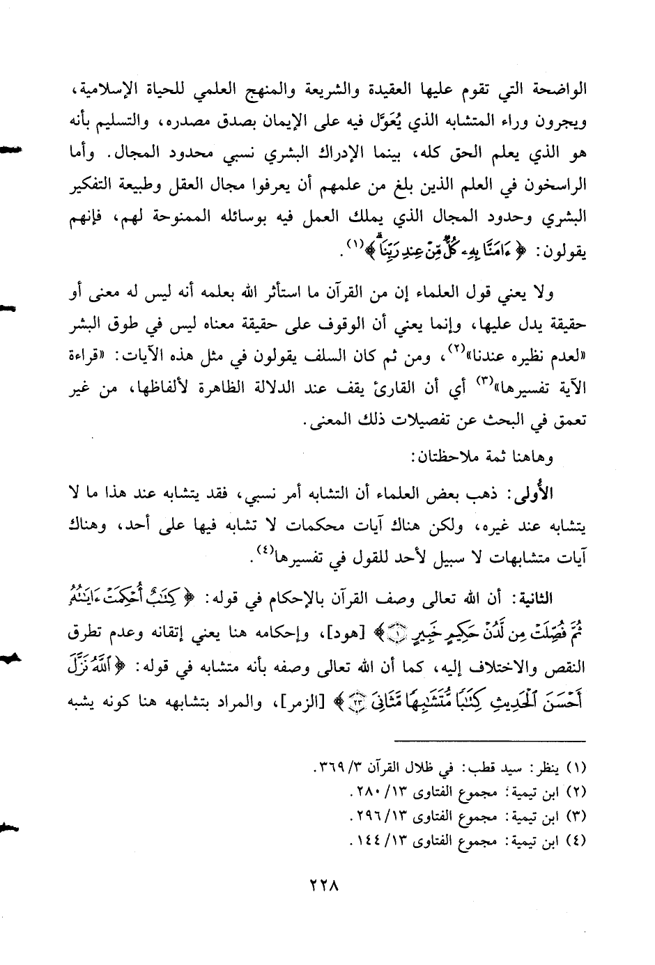 الأولى: ذهب بعض العلماء أن التشابه أمر نسبي، فقد يتشابه عند هذا ما لا يتشابه عند غيره، ولكن هناك آيات محكمات لا تشابه فيها على أحد، وهناك آيات متشابهات لا سبيل لأحد للقول في تفسيرها (¬4).