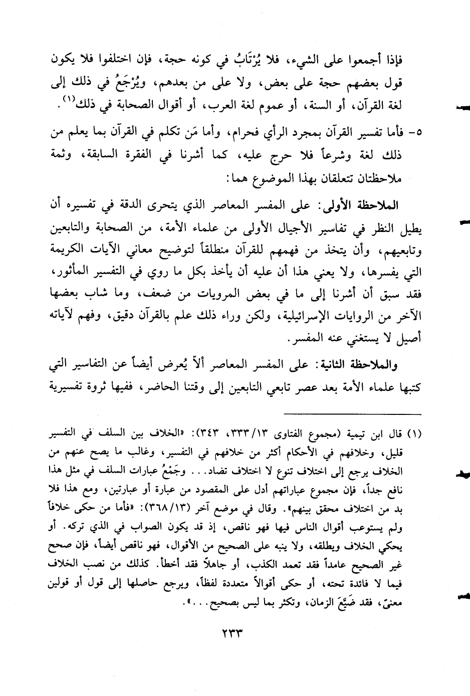(¬1) قال ابن تيمية (مجموع الفتاوى 13/ 333، 343): «الخلاف بين السلف في التفسير قليل، وخلافهم في الأحكام أكثر من خلافهم في التفسير، وغالب ما يصح عنهم من الخلاف يرجع إلى اختلاف تنوع لا اختلاف تضاد ... وجمع عبارات السلف في مثل هذا نافع جدا، فإن مجموع عباراتهم أدل على المقصود من عبارة أو عبارتين، ومع هذا فلا بد من اختلاف محقق بينهم». وقال في موضع آخر (13/ 368): «فأما من حكى خلافا ولم يستوعب أقوال الناس فيها فهو ناقص، إذ قد يكون الصواب في الذي تركه. أو يحكي الخلاف ويطلقه، ولا ينبه على الصحيح من الأقوال، فهو ناقص أيضا، فإن صحح غير الصحيح عامدا فقد تعمد الكذب، أو جاهلا فقد أخطأ. كذلك من نصب الخلاف فيما لا فائدة تحته، أو حكى أقوالا متعددة لفظا، ويرجع حاصلها إلى قول أو قولين معنى، فقد ضيّع الزمان، وتكثر بما ليس بصحيح ... ».