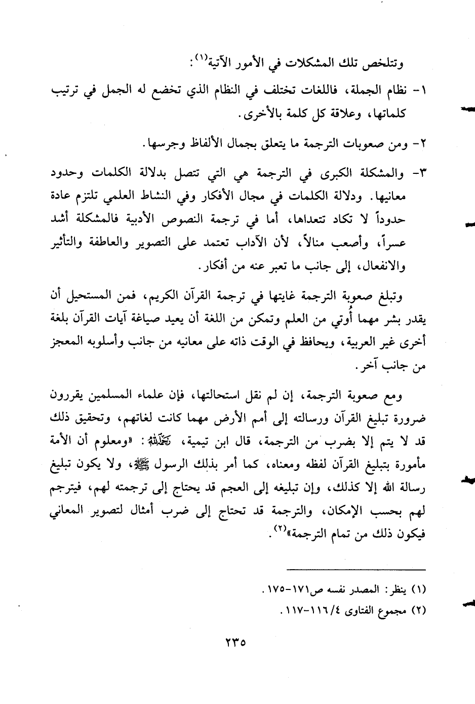 بضرب من الترجمة، قال ابن تيمية، رحمه الله: «ومعلوم أن الأمة مأمورة بتبليغ القرآن لفظه ومعناه، كما أمر بذلك الرسول صلى الله عليه وسلم، ولا يكون تبليغ رسالة الله إلا كذلك، وإن تبليغه إلى العجم قد يحتاج إلى ترجمته لهم، فيترجم لهم بحسب الإمكان، والترجمة قد تحتاج إلى ضرب أمثال لتصوير المعاني فيكون ذلك من تمام الترجمة» (¬2).