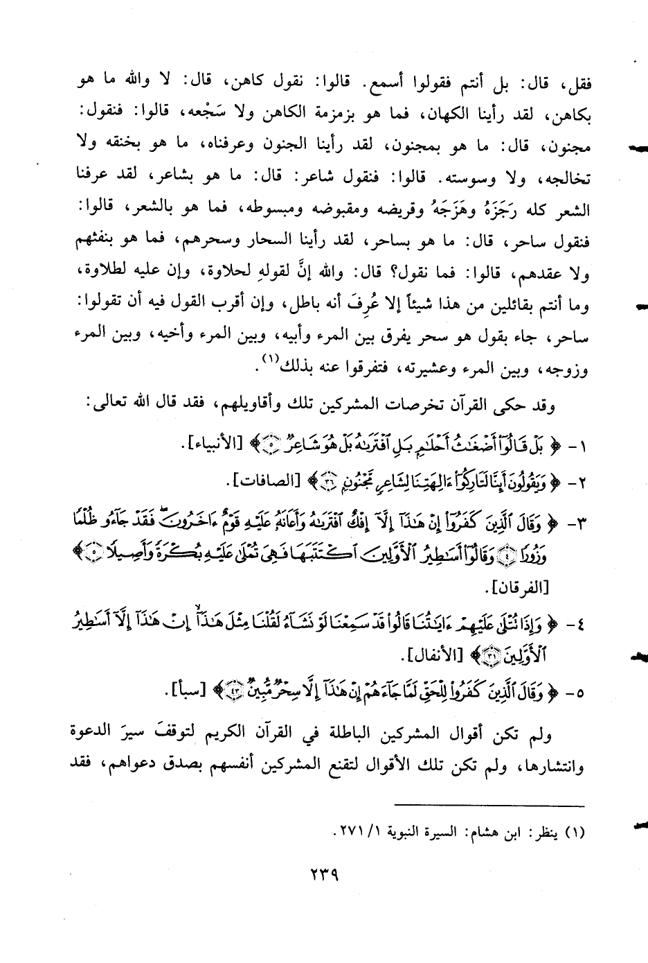 فنقول ساحر، قال: ما هو بساحر، لقد رأينا السحار وسحرهم، فما هو بنفثهم ولا عقدهم، قالوا: فما نقول؟ قال: والله إنّ لقوله لحلاوة، وإن عليه لطلاوة، وما أنتم بقائلين من هذا شيئا إلا عرف أنه باطل، وإن أقرب القول فيه أن تقولوا: