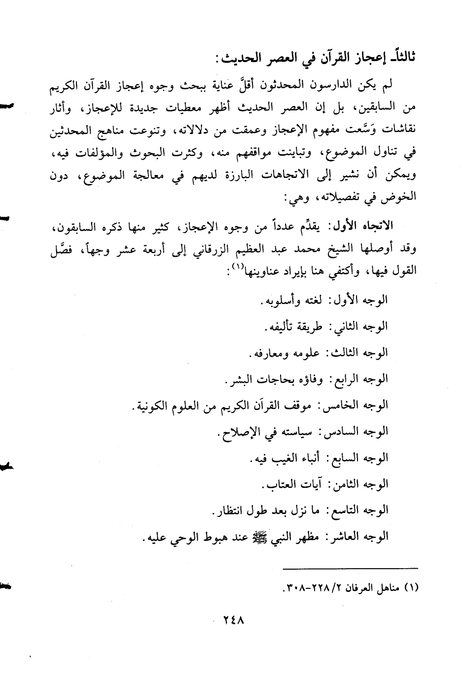 الاتجاه الأول: يقدّم عددا من وجوه الإعجاز، كثير منها ذكره السابقون، وقد أوصلها الشيخ محمد عبد العظيم الزرقاني إلى أربعة عشر وجها، فصّل القول فيها، وأكتفي هنا بإيراد عناوينها (¬1):