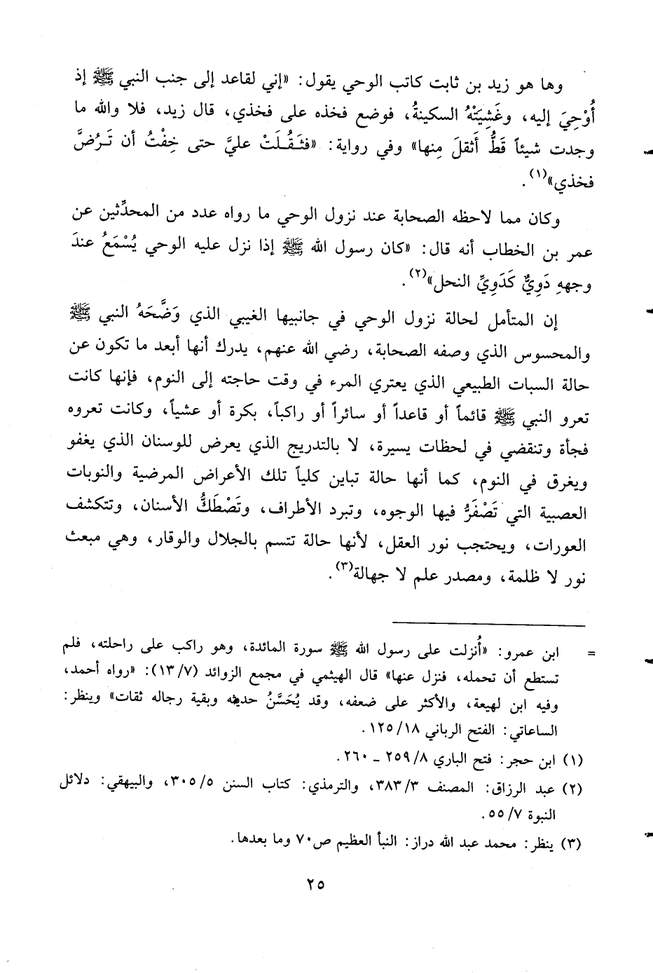 وها هو زيد بن ثابت كاتب الوحي يقول: «إني لقاعد إلى جنب النبي صلى الله عليه وسلم إذ أوحي إليه، وغشيته السكينة، فوضع فخذه على فخذي، قال زيد، فلا والله ما وجدت شيئا قطّ أثقل منها» وفي رواية: «فثقلت عليّ حتى خفت أن ترضّ فخذي» (¬1).