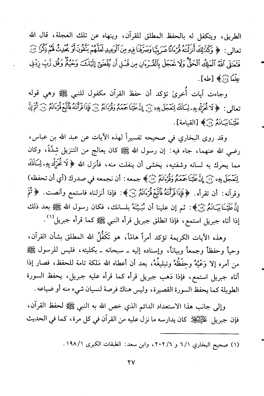 الطريق، ويتكفل له بالحفظ المطلق للقرآن، وينهاه عن تلك العجلة، قال الله تعالى: وَكَذلِكَ أَنْزَلْناهُ قُرْآناً عَرَبِيًّا وَصَرَّفْنا فِيهِ مِنَ الْوَعِيدِ لَعَلَّهُمْ يَتَّقُونَ أَوْ يُحْدِثُ لَهُمْ ذِكْراً (113) فَتَعالَى اللَّهُ الْمَلِكُ الْحَقُّ وَلا تَعْجَلْ بِالْقُرْآنِ مِنْ قَبْلِ أَنْ يُقْضى إِلَيْكَ وَحْيُهُ وَقُلْ رَبِّ زِدْنِي عِلْماً (114) [طه].