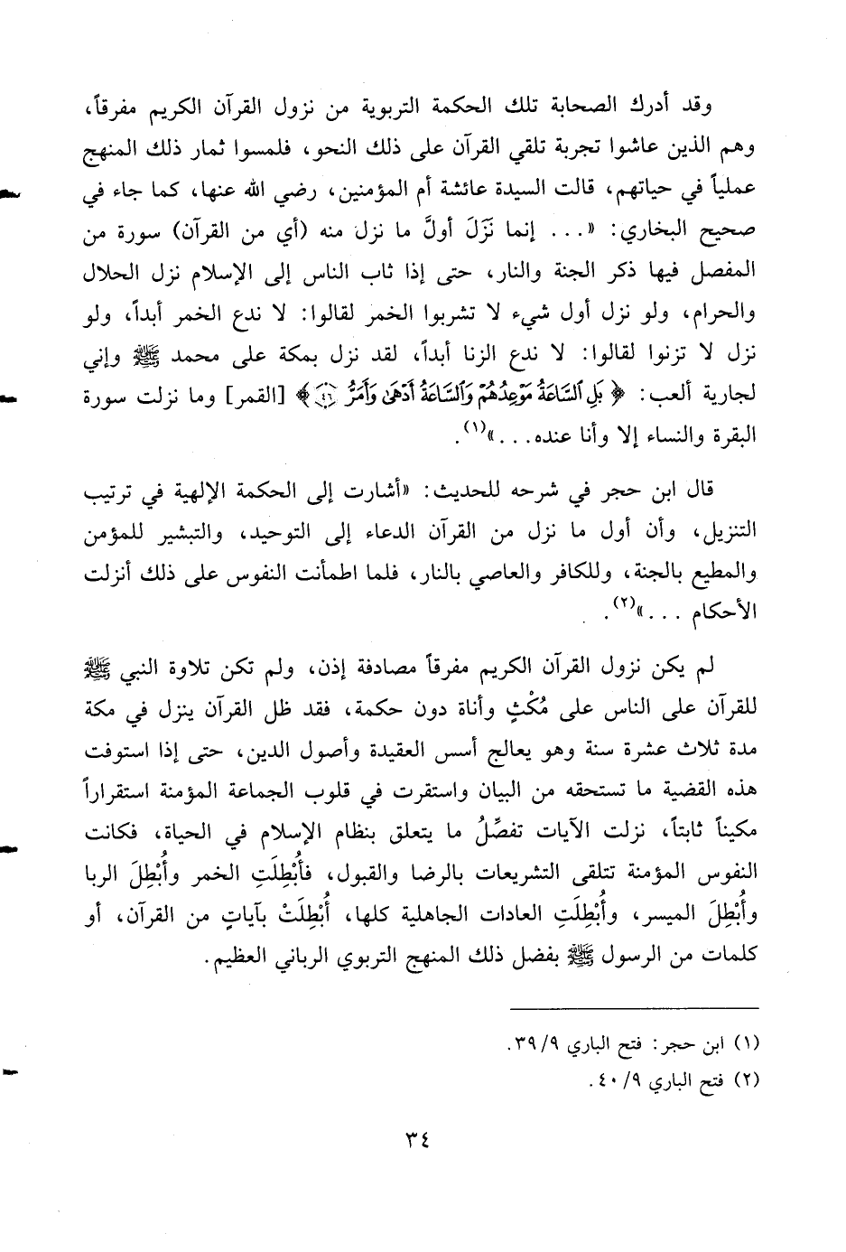 لم يكن نزول القرآن الكريم مفرقا مصادفة إذن، ولم تكن تلاوة النبي صلى الله عليه وسلم للقرآن على الناس على مكث وأناة دون حكمة، فقد ظل القرآن ينزل في مكة مدة ثلاث عشرة سنة وهو يعالج أسس العقيدة وأصول الدين، حتى إذا استوفت هذه القضية ما تستحقه من البيان واستقرت في قلوب الجماعة المؤمنة استقرارا مكينا ثابتا، نزلت الآيات تفصّل ما يتعلق بنظام الإسلام في الحياة، فكانت النفوس المؤمنة تتلقى التشريعات بالرضا والقبول، فأبطلت الخمر وأبطل الربا وأبطل الميسر، وأبطلت العادات الجاهلية كلها، أبطلت بآيات من القرآن، أو كلمات من الرسول صلى الله عليه وسلم بفضل ذلك المنهج التربوي الرباني العظيم.