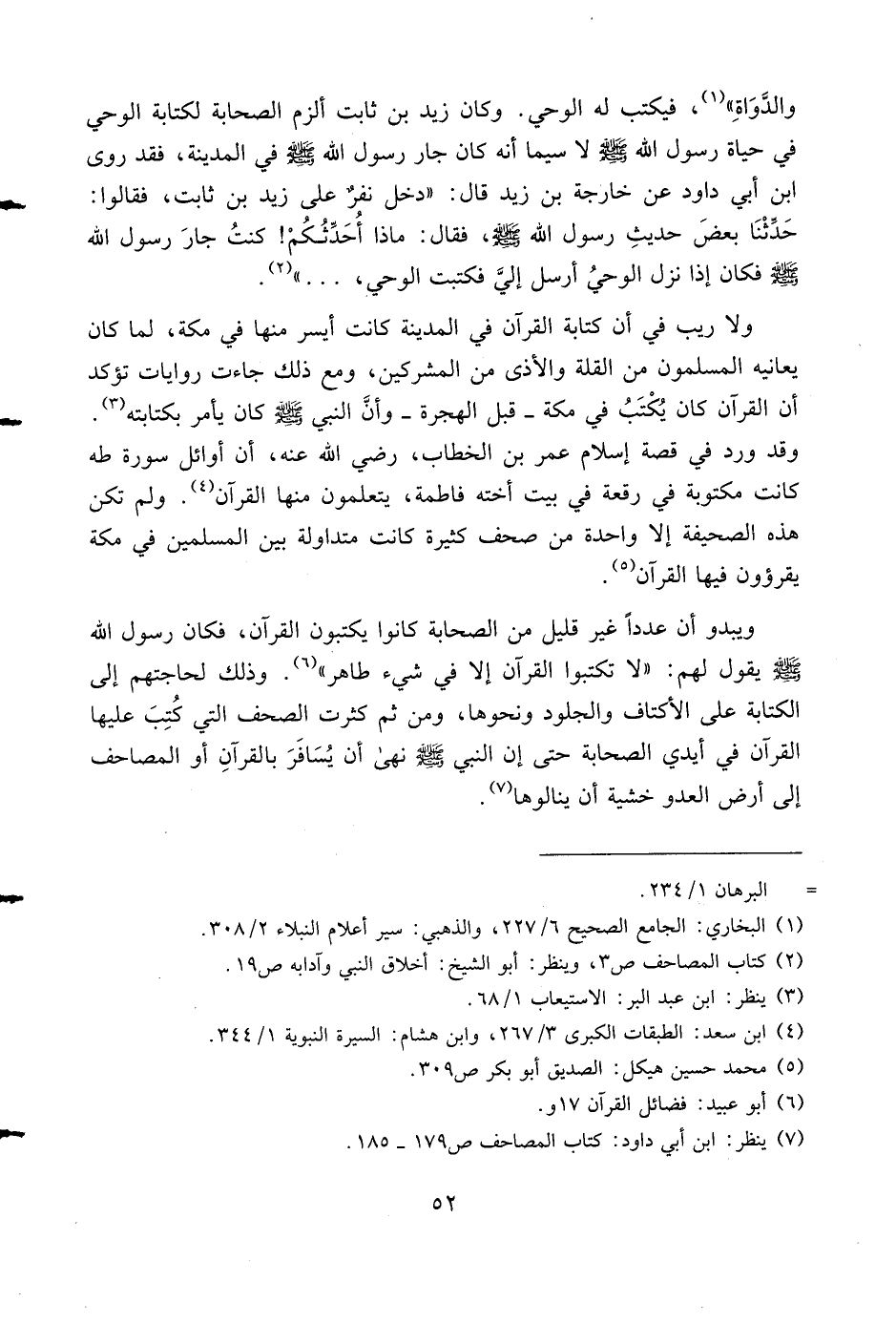 وقد ورد في قصة إسلام عمر بن الخطاب، رضي الله عنه، أن أوائل سورة طه كانت مكتوبة في رقعة في بيت أخته فاطمة، يتعلمون منها القرآن (¬4). ولم تكن هذه الصحيفة إلا واحدة من صحف كثيرة كانت متداولة بين المسلمين في مكة يقرءون فيها القرآن (¬5).