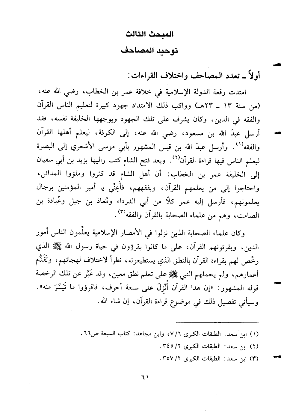 امتدت رقعة الدولة الإسلامية في خلافة عمر بن الخطاب، رضي الله عنه، (من سنة 13 - 23 هـ) وواكب ذلك الامتداد جهود كبيرة لتعليم الناس القرآن والفقه في الدين، وكان يشرف على تلك الجهود ويوجهها الخليفة نفسه، فقد أرسل عبد الله بن مسعود، رضي الله عنه، إلى الكوفة، ليعلم أهلها القرآن والفقه (¬1). وأرسل عبد الله بن قيس المشهور بأبي موسى الأشعري إلى البصرة ليعلم الناس فيها قراءة القرآن (¬2). وبعد فتح الشام كتب واليها يزيد بن أبي سفيان إلى الخليفة عمر بن الخطاب: أن أهل الشام قد كثروا وملئوا المدائن، واحتاجوا إلى من يعلمهم القرآن، ويفقههم، فأعنّي يا أمير المؤمنين برجال يعلمونهم، فأرسل إليه عمر كلا من أبي الدرداء ومعاذ بن جبل وعبادة بن الصامت، وهم من علماء الصحابة بالقرآن والفقه (¬3).