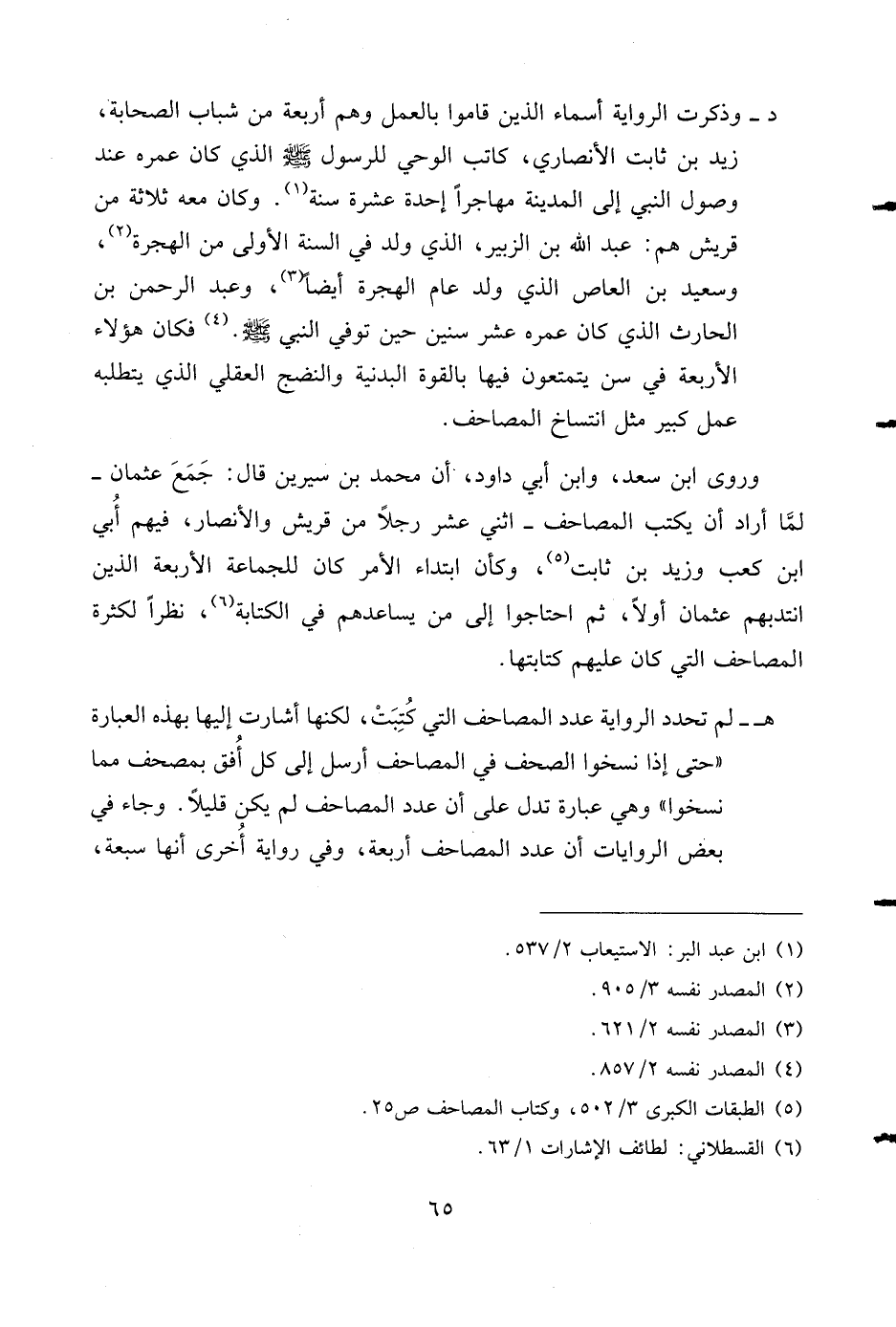 د- وذكرت الرواية أسماء الذين قاموا بالعمل وهم أربعة من شباب الصحابة، زيد بن ثابت الأنصاري، كاتب الوحي للرسول صلى الله عليه وسلم الذي كان عمره عند وصول النبي صلى الله عليه وسلم إلى المدينة مهاجرا إحدى عشرة سنة (¬1). وكان معه ثلاثة من قريش هم: عبد الله بن الزبير، الذي ولد في السنة الأولى من الهجرة (¬2)، وسعيد بن العاص الذي ولد عام الهجرة أيضا (¬3)، وعبد الرحمن بن الحارث الذي كان عمره عشر سنين حين توفي النبي صلى الله عليه وسلم. (¬4) فكان هؤلاء الأربعة في سن يتمتعون فيها بالقوة البدنية والنضج العقلي الذي يتطلبه عمل كبير مثل انتساخ المصاحف.