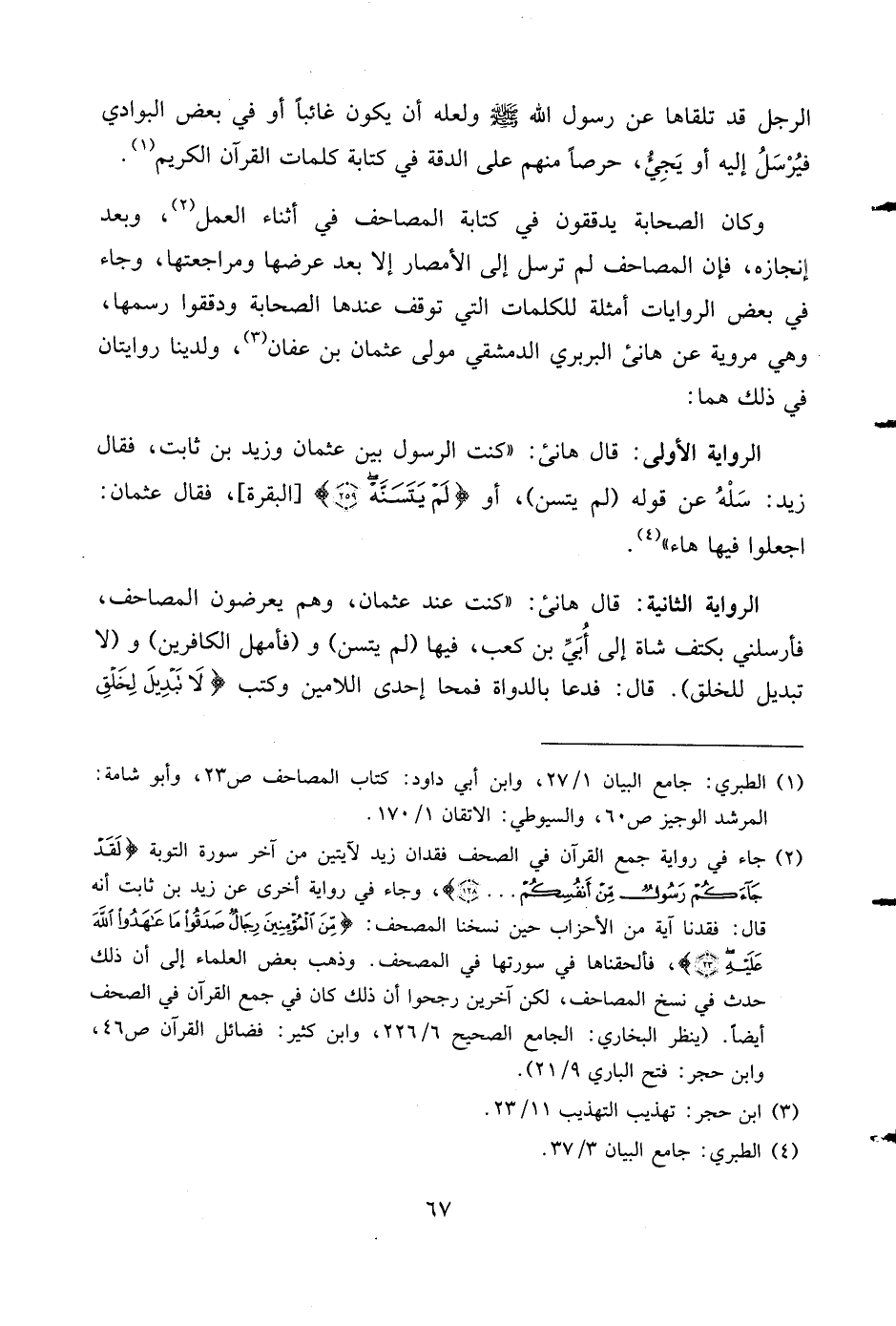 الرجل قد تلقاها عن رسول الله صلى الله عليه وسلم ولعله أن يكون غائبا أو في بعض البوادي فيرسل إليه أو يجيء، حرصا منهم على الدقة في كتابة كلمات القرآن الكريم (¬1).
