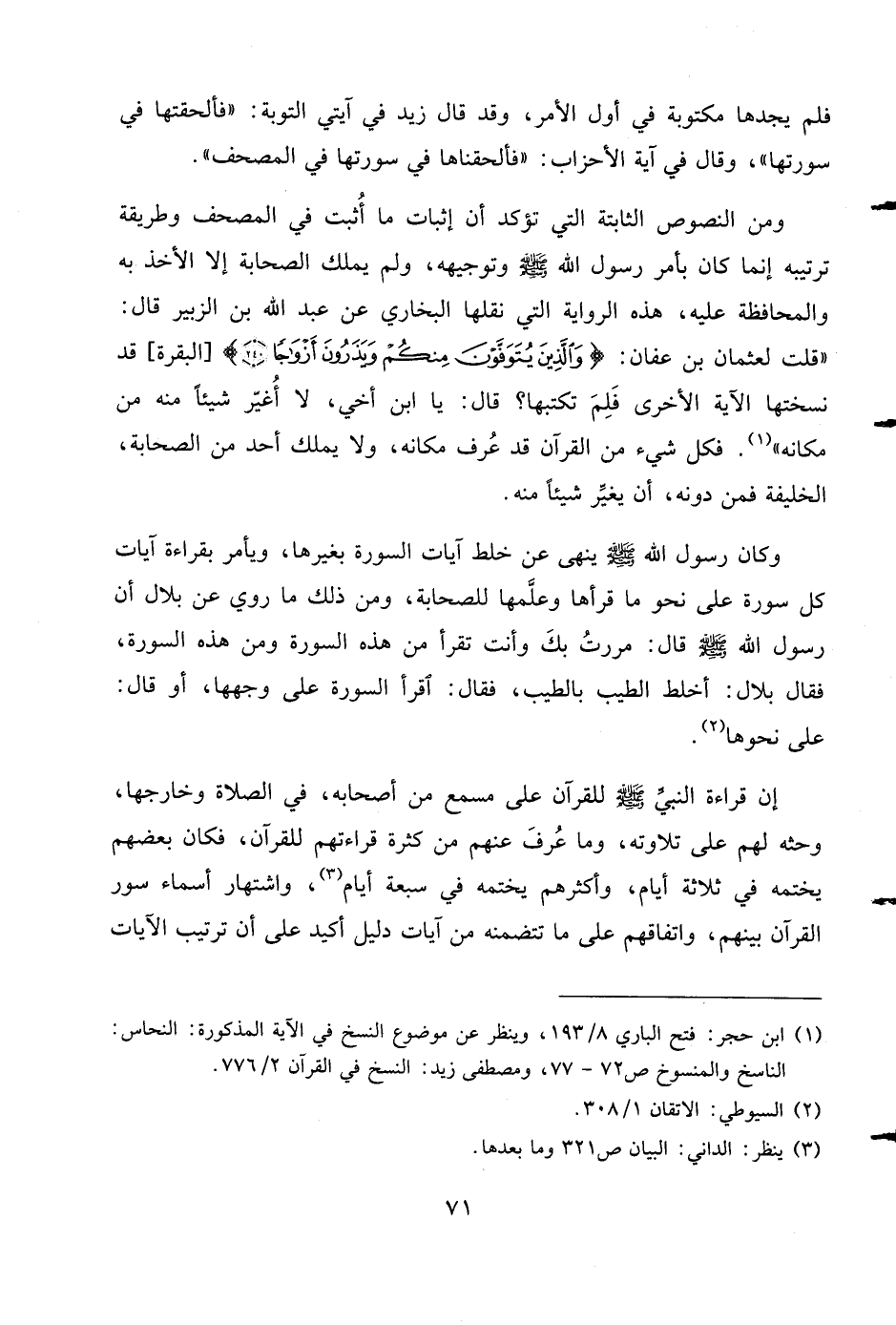 «قلت لعثمان بن عفان: وَالَّذِينَ يُتَوَفَّوْنَ مِنْكُمْ وَيَذَرُونَ أَزْواجاً (240) [البقرة] قد نسختها الآية الأخرى فلم تكتبها؟ قال: يا ابن أخي، لا أغيّر شيئا منه من مكانه» (¬1). فكل شيء من القرآن قد عرف مكانه، ولا يملك أحد من الصحابة، الخليفة فمن دونه، أن يغيّر شيئا منه.