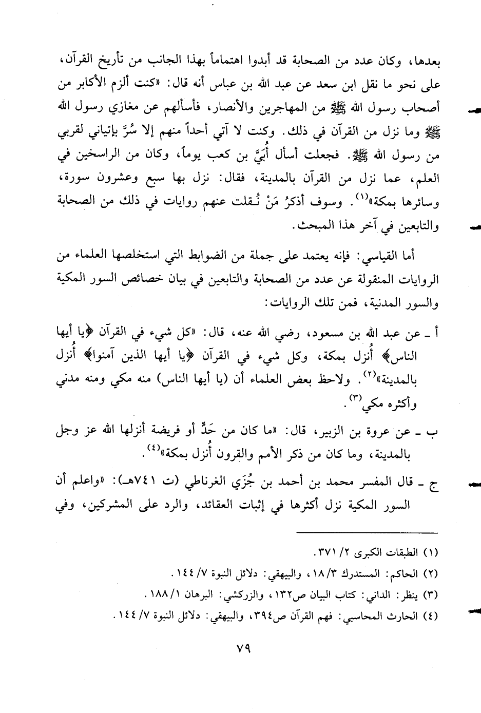 بعدها، وكان عدد من الصحابة قد أبدوا اهتماما بهذا الجانب من تأريخ القرآن، على نحو ما نقل ابن سعد عن عبد الله بن عباس أنه قال: «كنت ألزم الأكابر من أصحاب رسول الله صلى الله عليه وسلم من المهاجرين والأنصار، فأسألهم عن مغازي رسول الله صلى الله عليه وسلم وما نزل من القرآن في ذلك. وكنت لا آتي أحدا منهم إلا سرّ بإتياني لقربي من رسول الله صلى الله عليه وسلم. فجعلت أسأل أبيّ بن كعب يوما، وكان من الراسخين في العلم، عما نزل من القرآن بالمدينة، فقال: نزل بها سبع وعشرون سورة، وسائرها بمكة» (¬1). وسوف أذكر من نقلت عنهم روايات في ذلك من الصحابة والتابعين في آخر هذا المبحث.