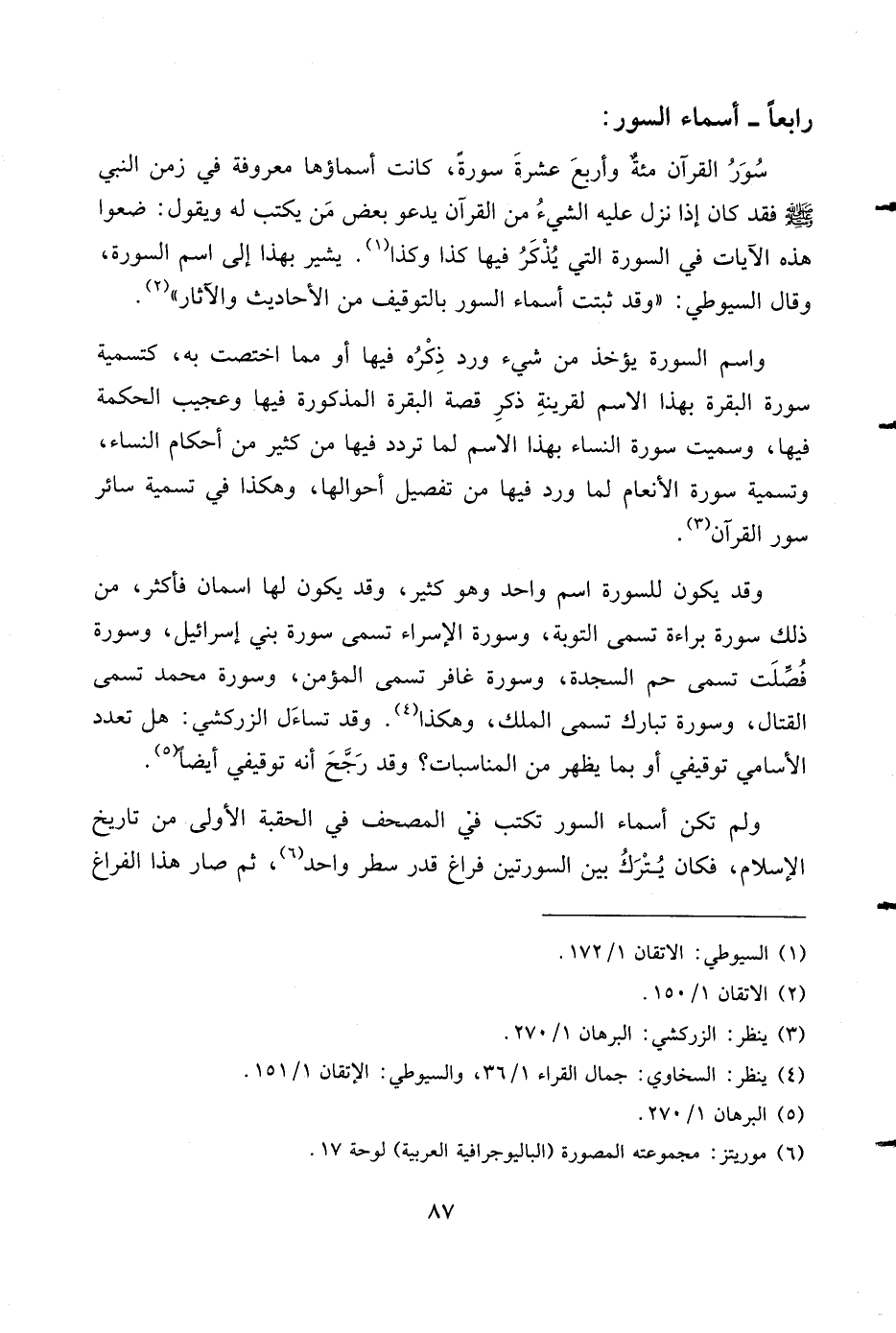 ولم تكن أسماء السور تكتب في المصحف في الحقبة الأولى من تاريخ الإسلام، فكان يترك بين السورتين فراغ قدر سطر واحد (¬6)، ثم صار هذا الفراغ