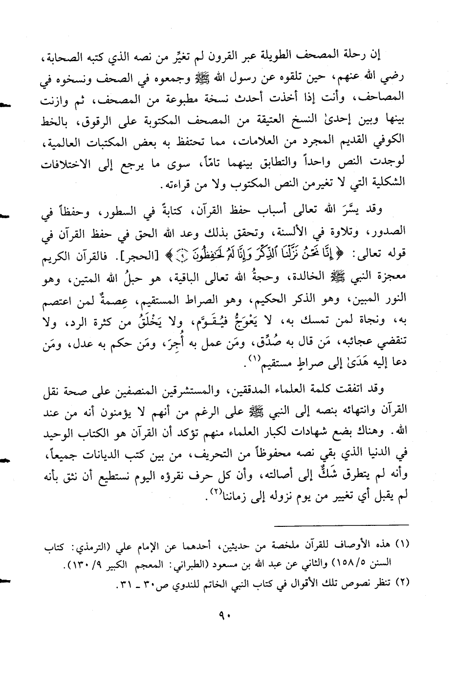 وقد اتفقت كلمة العلماء المدققين، والمستشرقين المنصفين على صحة نقل القرآن وانتهائه بنصه إلى النبي صلى الله عليه وسلم على الرغم من أنهم لا يؤمنون أنه من عند الله. وهناك بضع شهادات لكبار العلماء منهم تؤكد أن القرآن هو الكتاب الوحيد في الدنيا الذي بقي نصه محفوظا من التحريف، من بين كتب الديانات جميعا، وأنه لم يتطرق شكّ إلى أصالته، وأن كل حرف نقرؤه اليوم نستطيع أن نثق بأنه لم يقبل أي تغيير من يوم نزوله إلى زماننا (¬2).