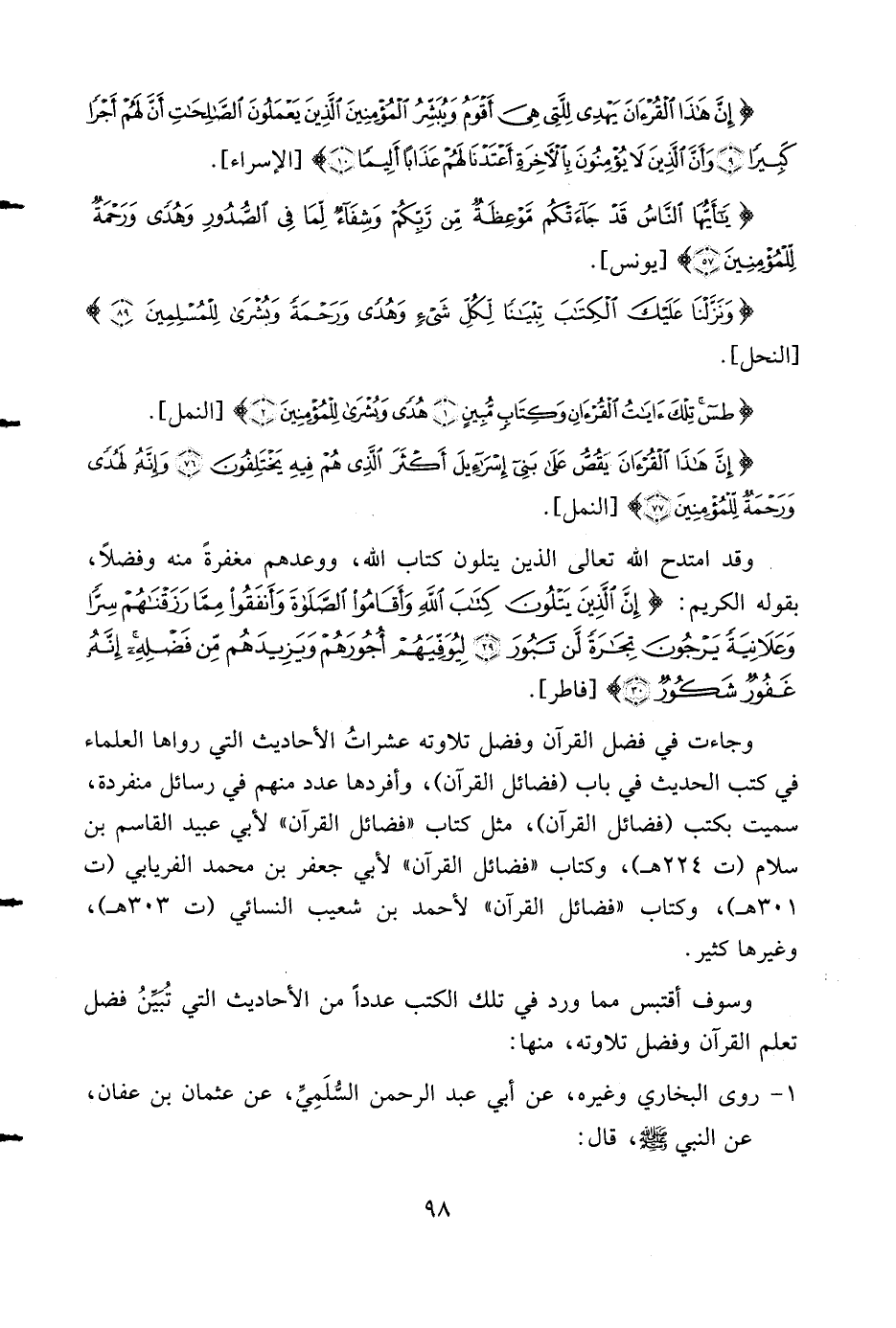 1 - روى البخاري وغيره، عن أبي عبد الرحمن السّلميّ، عن عثمان بن عفان، عن النبي صلى الله عليه وسلم، قال: