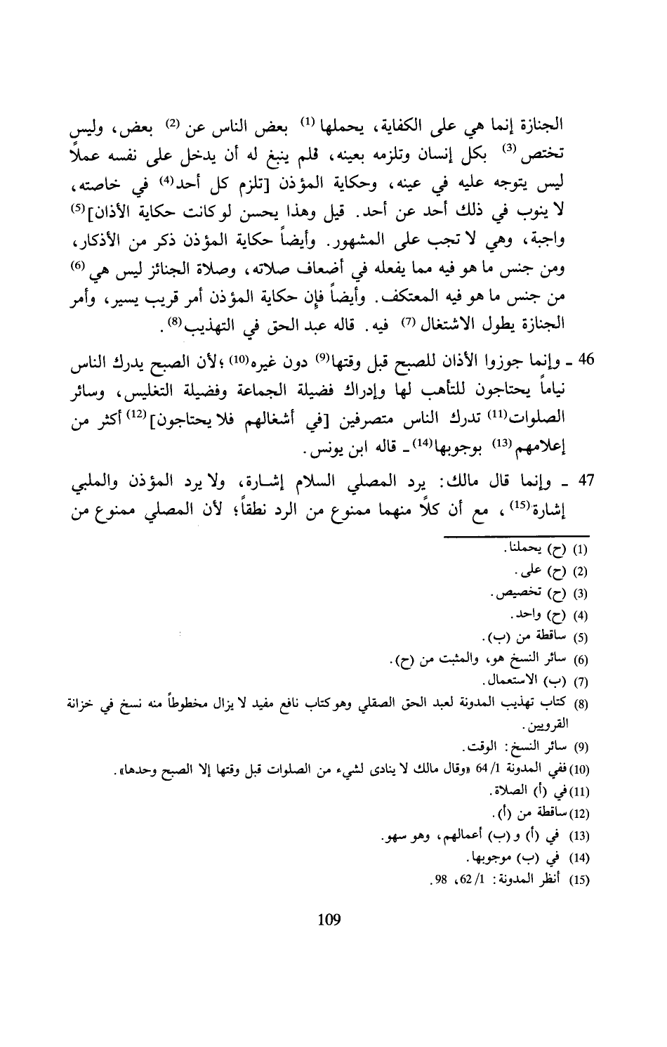 (¬10) ففي المدونة 1/ 64 "وقال مالك لا ينادى لشيء من الصلوات قبل وقتها إلا الصبح وحدها".