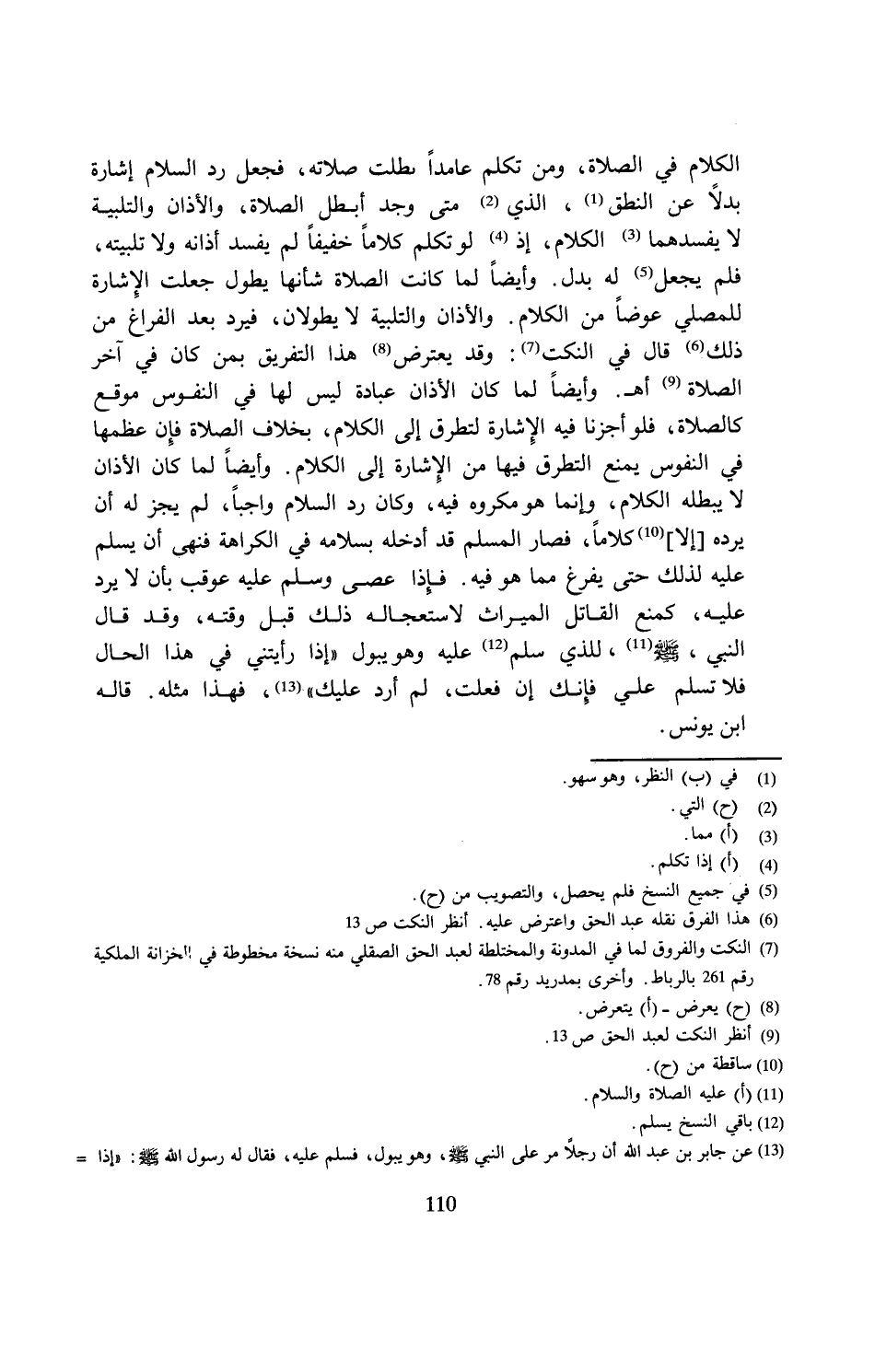 الكلام في الصلاة، ومن تكلم عامدًا بطلت صلاته، فجعل رد السلام إشارة بدلًا عن النطق (¬1)، الذي (¬2) متى وجد أبطل الصلاة، والأذان والتلبية لا يفسدهما (¬3) الكلام، إذ (¬4) لو تكلم كلامًا خفيفًا لم يفسد أذانه ولا تلبيته، فلم يجعل (¬5) له بدل. وأيضًا لما كانت الصلاة شأنها يطول جعلت الإِشارة للمصلي عوضًا من الكلام. والأذان والتلبية لا يطولان، فيرد بعد الفراغ من ذلك (¬6) قال في النكت (¬7): وقد يعترض (¬8) هذا التفريق بمن كان في آخر الصلاة (¬9) أهـ. وأيضًا لما كان الأذان عبادة ليس لها في النفوس موقع كالصلاة، فلو أجزنا فيه الإِشارة لتطرق إلى الكلام، بخلاف الصلاة فإِن عظمها في النفوس يمنع التطرق فيها من الإِشارة إلى الكلام. وأيضًا لما كان الأذان لا يبطله الكلام، وإنما هو مكروه فيه، وكان رد السلام واجبًا، لم يجز له أن يرده [إلا] (¬10) كلامًا، فصار المسلم قد أدخله بسلامه في الكراهة فنهى أن يسلم عليه لذلك حتى يفرغ مما هو فيه. فإذا عصى وسلم عليه عوقب بأن لا يرد عليه، كمنع القاتل الميراث لاستعجاله ذلك قبل وقته، وقد قال النبي، - صلى الله عليه وسلم - (¬11)، للذي سلم (¬12) عليه وهو يبول "إذا رأيتني في هذا الحال فلا تسلم علي فإنك إن فعلت، لم أرد عليك" (¬13)، فهذا مثله. قاله ابن يونس.