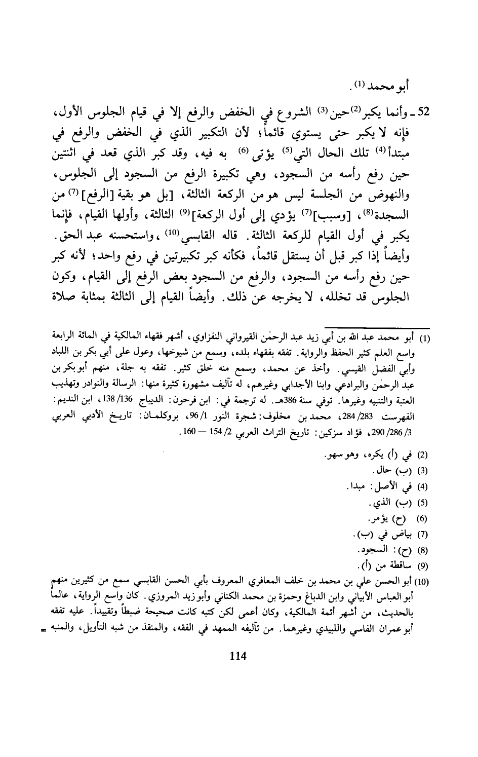 (¬1) أبو محمد عبد الله بن أبي زيد عبد الرحمن القيرواني النفزاوي، أشهر فقهاء المالكية في المائة الرابعة واسع العلم كثير الحفظ والرواية. تفقه بفقهاء بلده، وسمع من شيوخها، وعول على أبي بكر بن اللباد وأبي الفضل القيسي. وأخذ عن محمد، وسمع منه خلق كثير. تفقه به جلة، منهم أبو بكر بن عبد الرحمن والبرادعي وابنا الأجدابي وغيرهم، له تآليف مشهورة كثيرة منها: الرسالة والنوادر وتهذيب العتبة والتنبيه وغيرها. توفي سنة 386 هـ. له ترجمة في: ابن فرحون: الديباج 136/ 138، ابن النديم: الفهرست 283/ 284، محمد بن مخلوف: شجرة النور 1/ 96، بروكلمان: تاريخ الأدبي العربي 3/ 286 / 290، فؤاد سزكين: تاريخ التراث العربي 2/ 154 - 160.