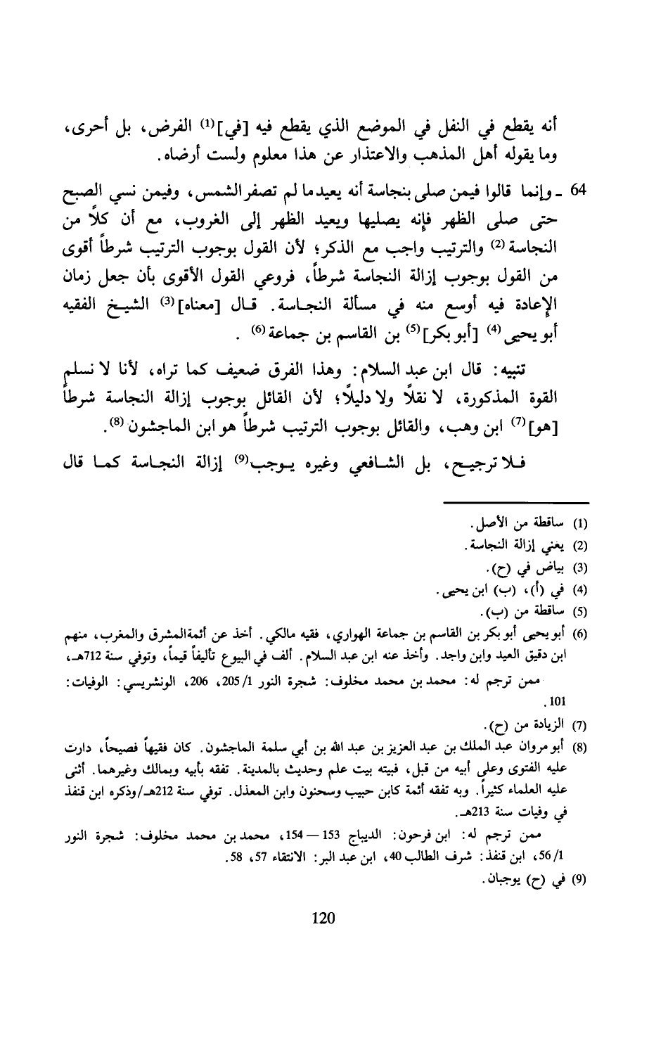 64 - وإنما قالوا فيمن صلى بنجاسة أنه يعيد ما لم تصفر الشمس، وفيمن نسي الصبح حتى صلى الظهر فإنه يصليها ويعيد الظهر إلى الغروب، مع أن كلًّا من النجاسة (¬2) والترتيب واجب مع الذكر؛ لأن القول بوجوب الترتيب شرطًا أقوى من القول بوجوب إزالة النجاسة شرطًا، فروعي القول الأقوى بأن جعل زمان الإعادة فيه أوسع منه في مسألة النجاسة. قال [معناه] (¬3) الشيخ الفقيه أبو يحيى (¬4) [أبو بكر] (¬5) بن القاسم بن جماعة (¬6).