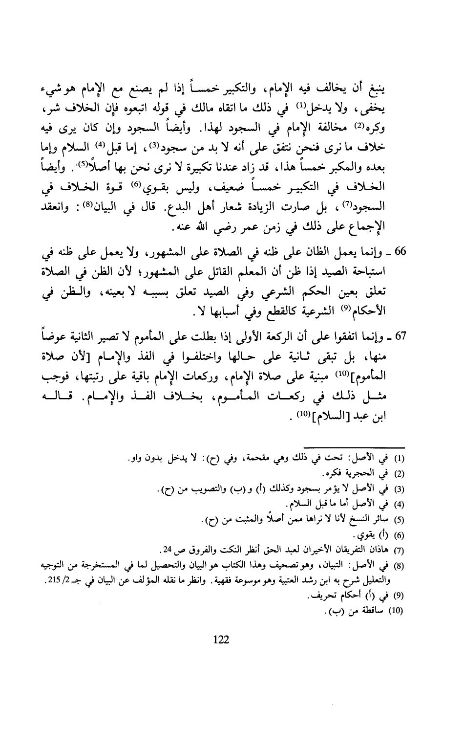 67 - وإنما اتفقوا على أن الركعة الأولى إذا بطلت على المأموم لا تصير الثانية عوضًا منها، بل تبقى ثانية على حالها واختلفوا في الفذ والإِمام (لأن صلاة المأموم] (10) مبنية على صلاة الإمام، وركعات الإِمام باقية على رتبتها، فوجب مثل ذلك في ركعات المَأموم، بخلاف الفذ والإِمام. قاله ابن عبد [السلام] (¬10).