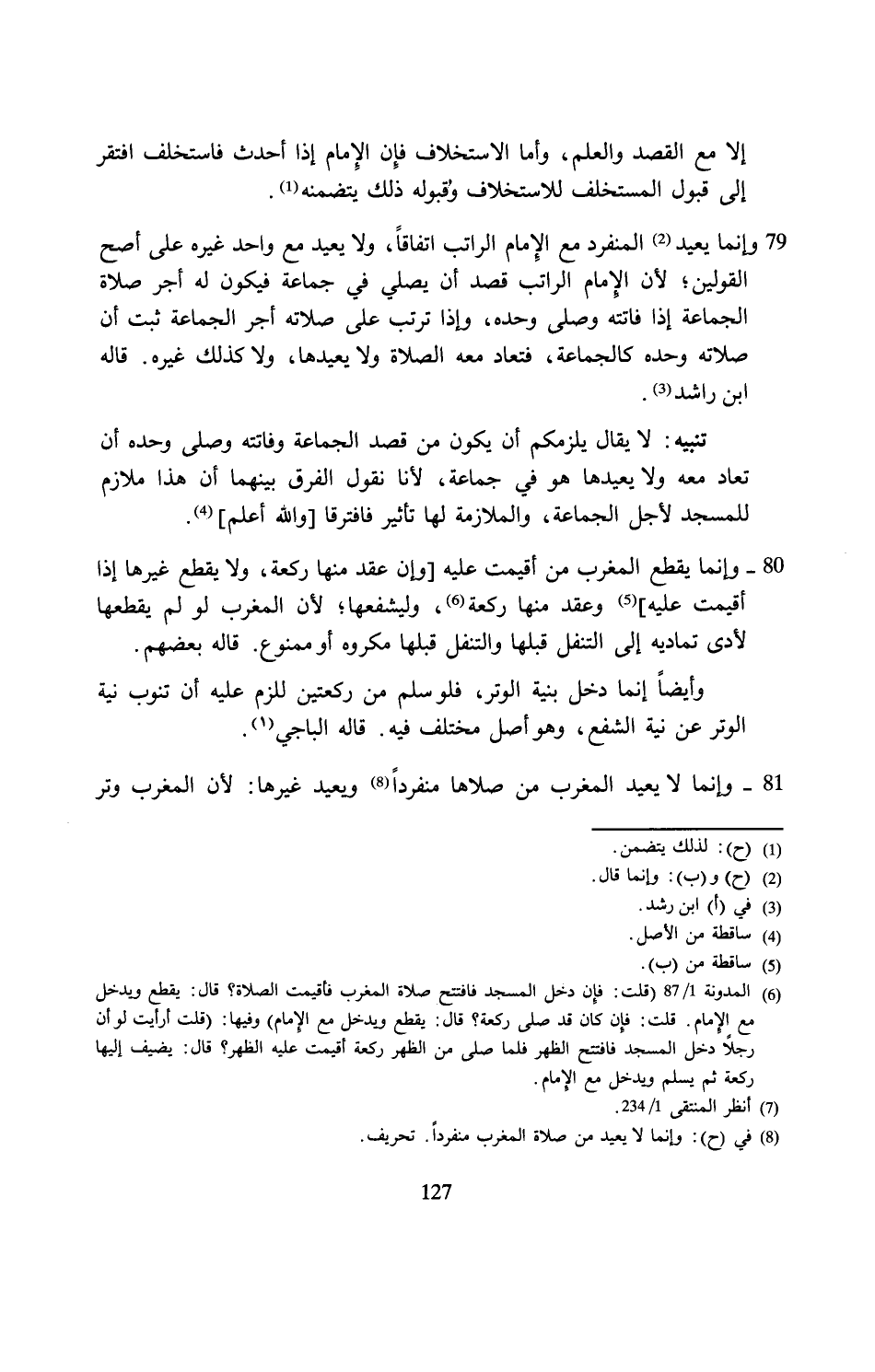 81 - وإنما لا يعيد المغرب من صلاها منفردًا (¬8) ويعيد غيرها: لأن المغرب وتر