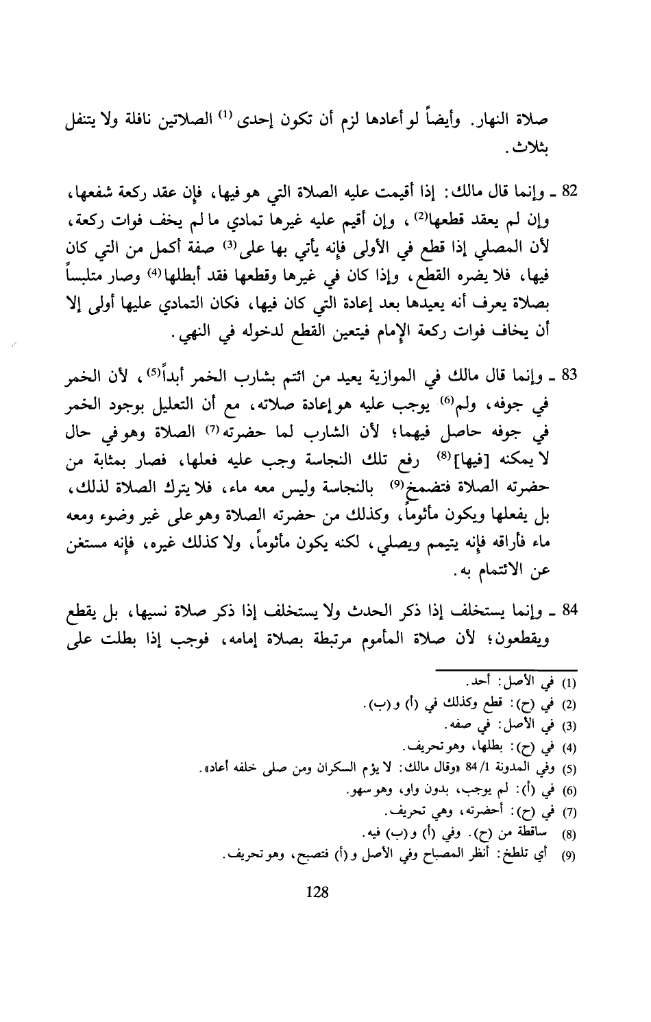 83 - وإنما قال مالك في الموازية يعيد من ائتم بشارب الخمر أبدًا (¬5)، لأن الخمر في جوفه، ولم (¬6) يوجب عليه هو إعادة صلاته، مع أن التعليل بوجود الخمر في جوفه حاصل فيهما؛ لأن الشارب لما حضرته (¬7) الصلاة وهو في حال لا يمكنه [فيها] (¬8) رفع تلك النجاسة وجب عليه فعلها، فصار بمثابة من حضرته الصلاة فتضمخ (¬9) بالنجاسة وليس معه ماء، فلا يترك الصلاة لذلك، بل يفعلها ويكون مأثومًا، وكذلك من حضرته الصلاة وهو على غير وضوء ومعه ماء فأراقه فإِنه يتيمم ويصلي، لكنه يكون مأثومًا، ولا كذلك غيره، فإِنه مستغن عن الائتمام به.